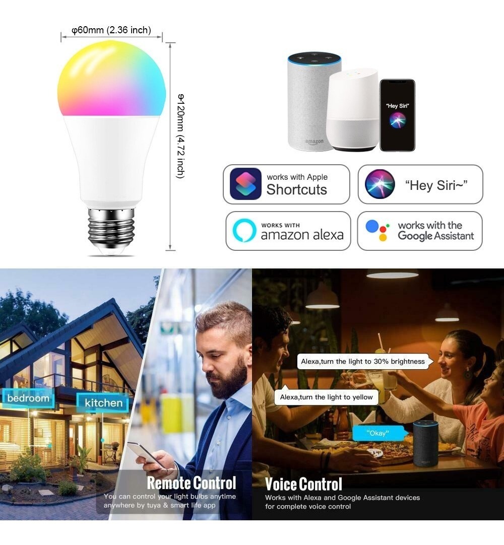 Tipo: bombilla LED inteligente WiFi Material: aluminio de aviación, Plástico Color del artículo: blanco Función: Control mediante WiFi. Compatible con Amazon Alexa, Echo, Google Home Assistant. Color de la luz: RGB + blanco frio (2700K) RGB + blanco (5700K) Dimmable Tipo de enchufe: E27 Potencia: 9W Voltaje: ca 85-265V Chip: LED SMD 2835 CRI: >85 Lumen: 90 LM/W Vida: >100000h Ángulo del haz: 270 grados Tamaño: 6*12,3 cm/2,4*4,8