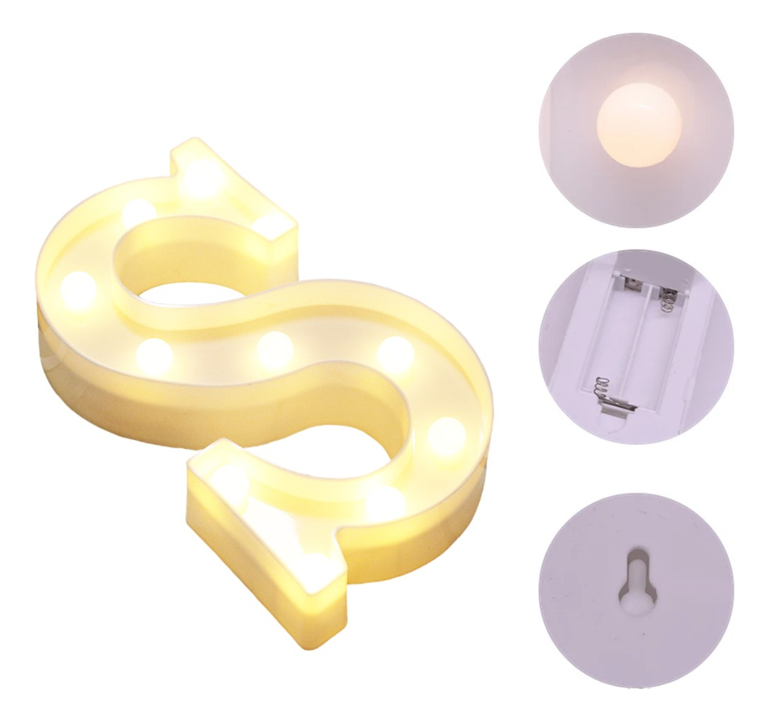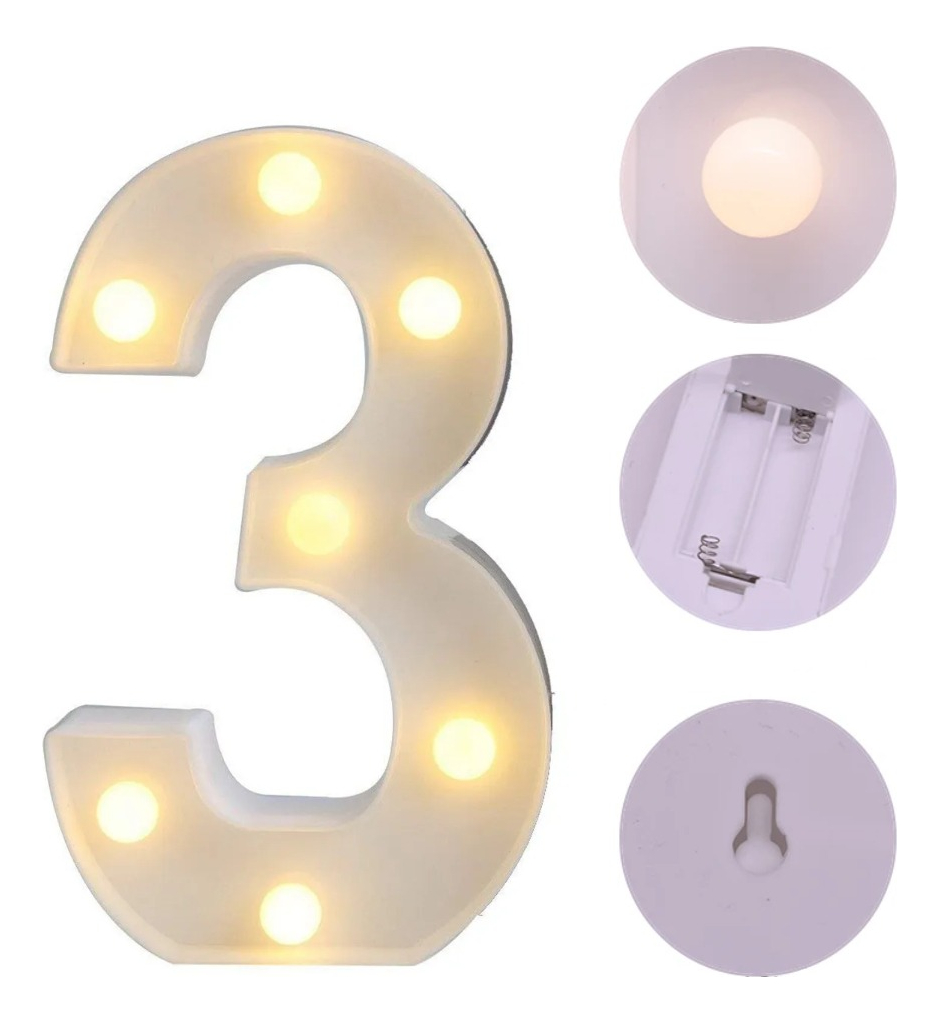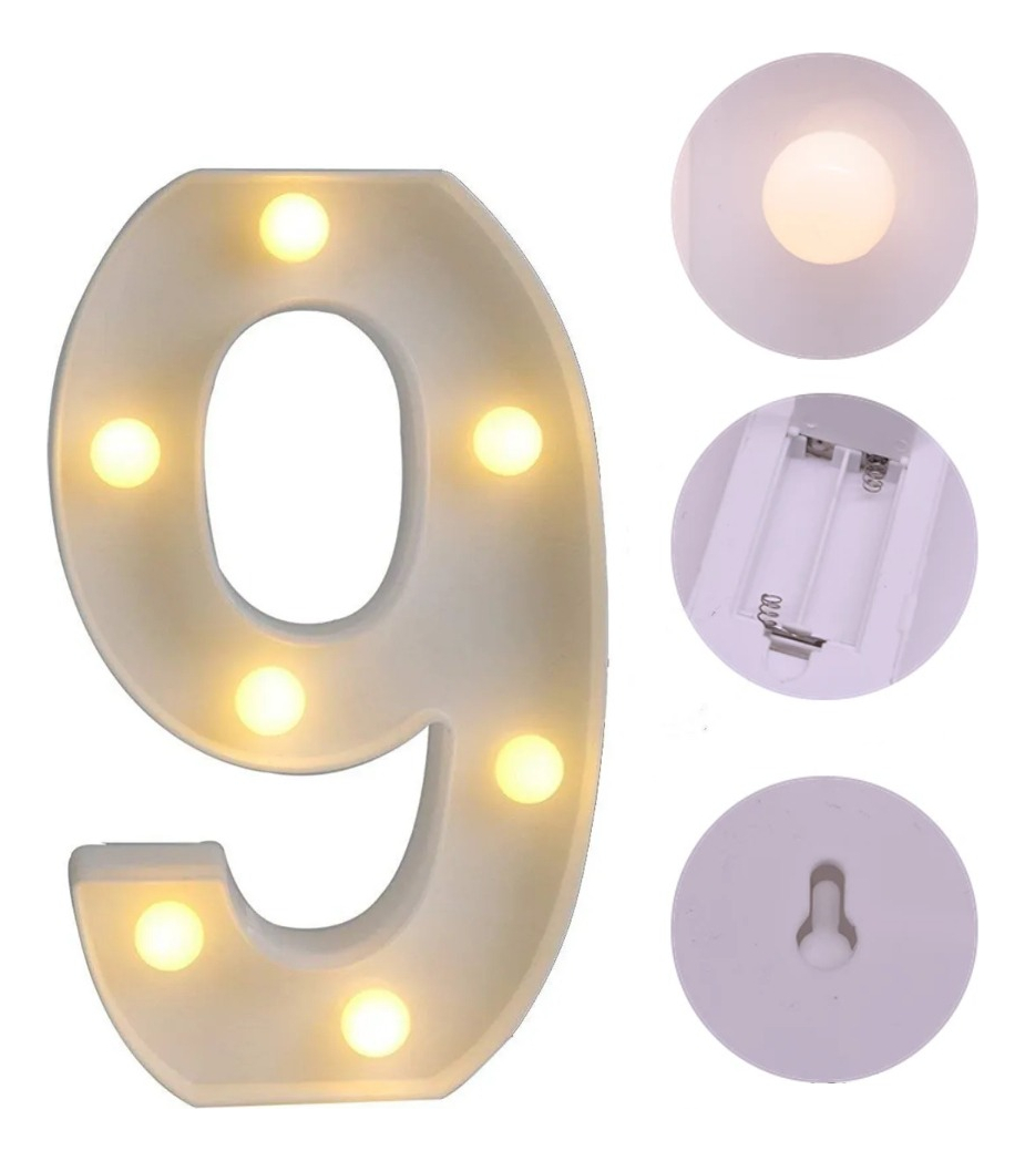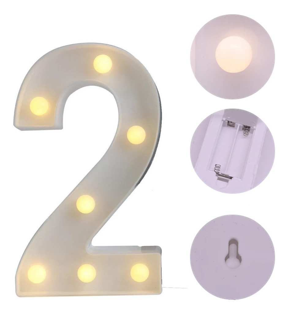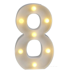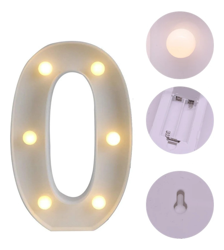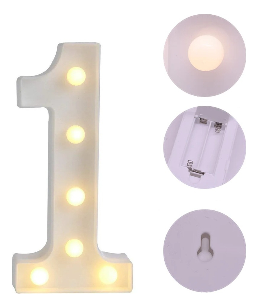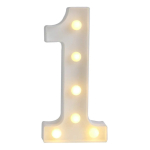 Letras y números LED corpóreos ideales para decoración de fiestas. Fabricados en plástico, cuentan con un interruptor on/off y se pueden colgar en la pared. La luz LED emite un color blanco cálido y funciona con 2 pilas AA (no incluidas).