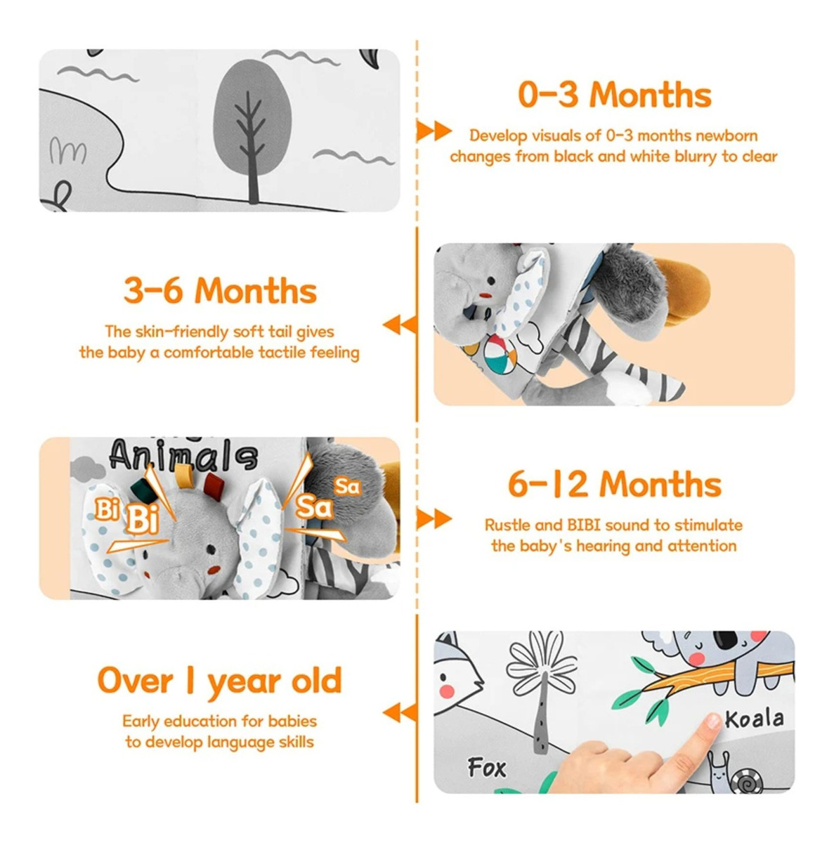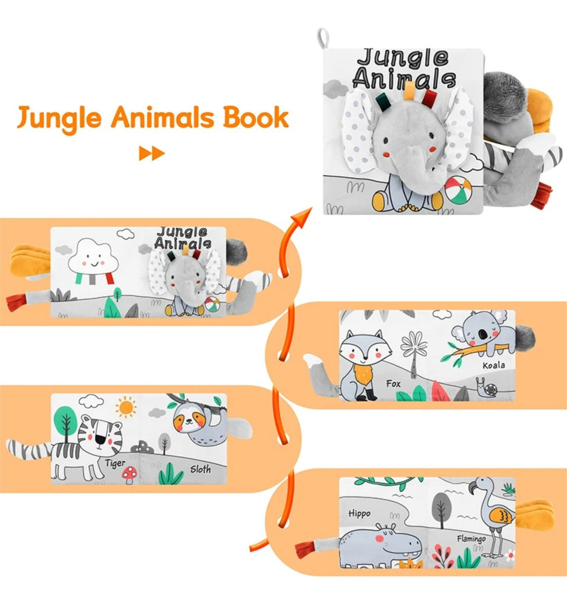 Este libro de tela es ideal para los más pequeños, diseñado para estimular sus sentidos desde la primera infancia. Con ilustraciones coloridas y texturas suaves, el libro enseña sobre las colas de diferentes animales, promoviendo el aprendizaje visual y táctil. Perfecto para desarrollar habilidades motoras y cognitivas mientras se divierten. Es resistente, lavable y seguro para bebés. ¡Un regalo ideal para los primeros momentos de descubrimiento!
