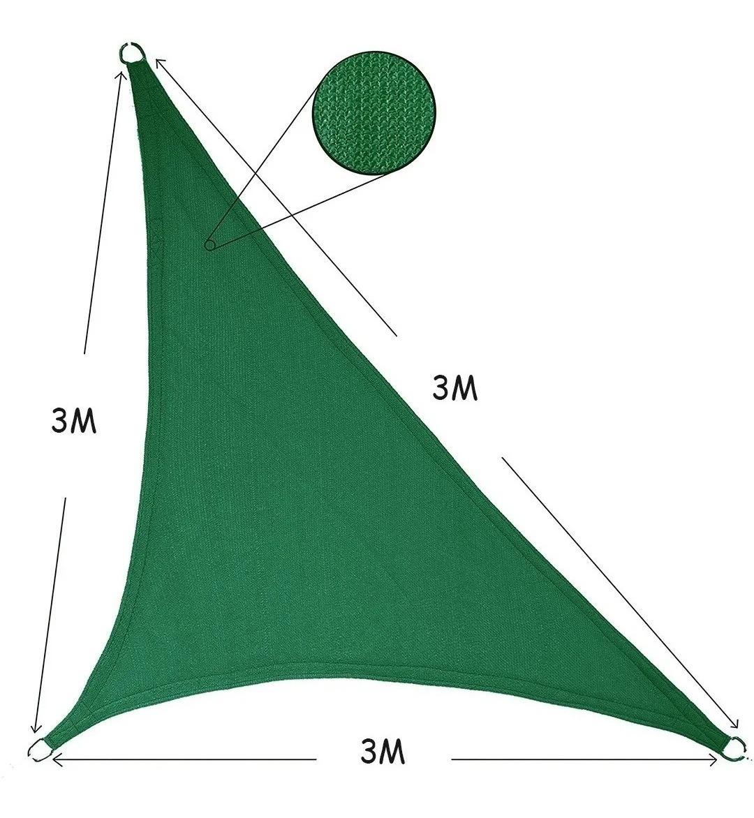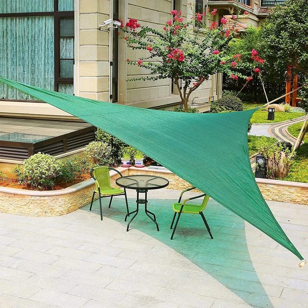 Toldo triangular de alta calidad, fabricado con polietileno tejido de larga duración que permite el paso de la lluvia, evitando la acumulación de agua. Su avanzado tejido bloquea entre el 90-95% de los rayos UV dañinos, manteniendo la transpirabilidad y circulación del aire. Las esquinas reforzadas y cosidas con argollas permiten una instalación rápida y fácil. Se monta y desmonta en pocos minutos. Incluye cuerdas para su fijación. Ideal para ofrecer sombra y protección en exteriores.