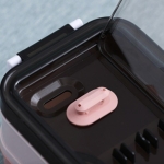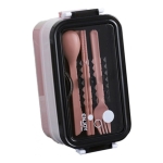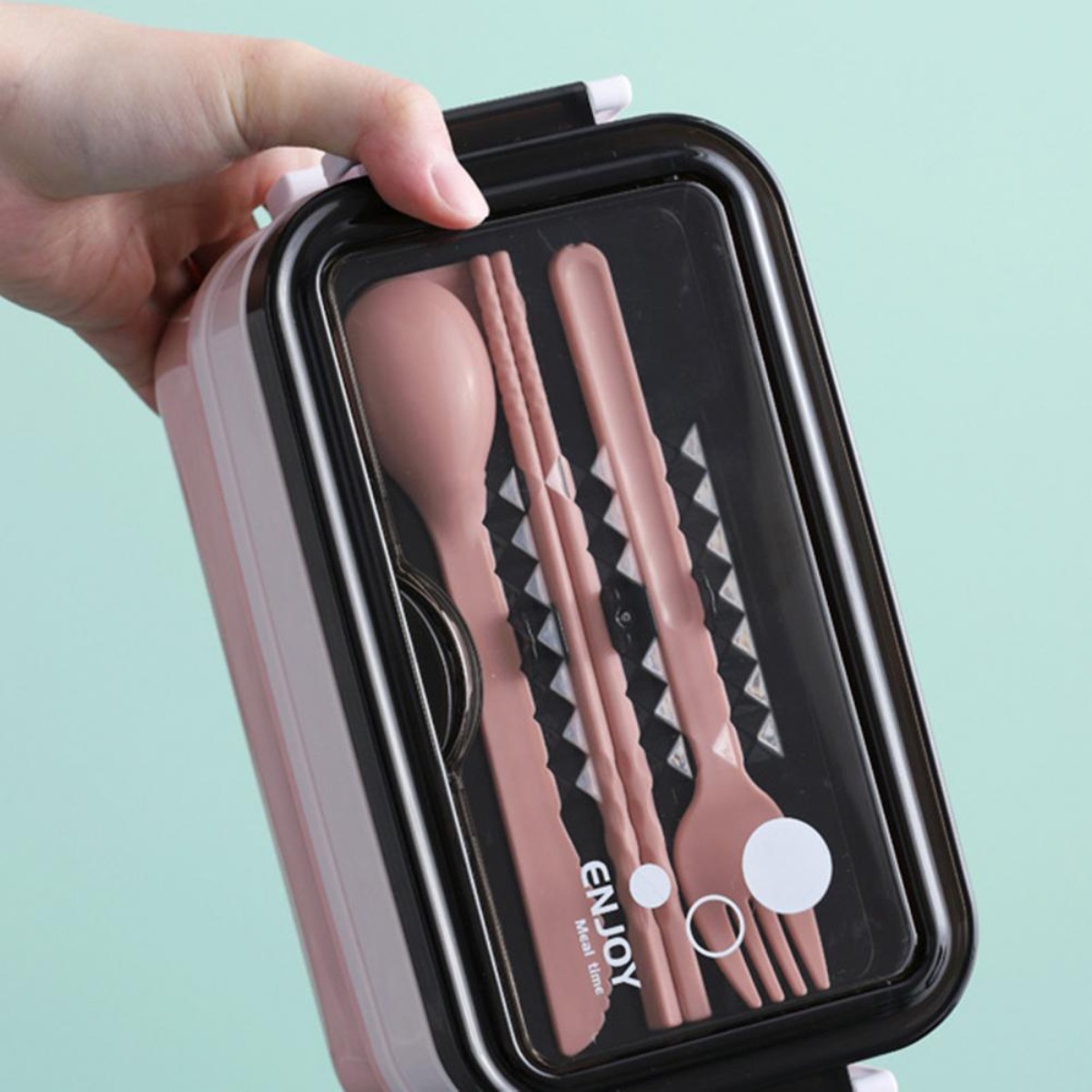 Vianda estilo bento box de doble piso, el piso inferior es de un compartimento, ideal para platos principales, o alimentos grandes, el segundo piso está dividido en 2 compartimentos (Ver imágenes) y cuenta con un tercer compartimento donde se almacenan 2 palitos chinos, un tenedor y un cuchillo/cuchara, una vez quitado los cubiertos pude utilizarse sus canaletas para apoyar el celular.