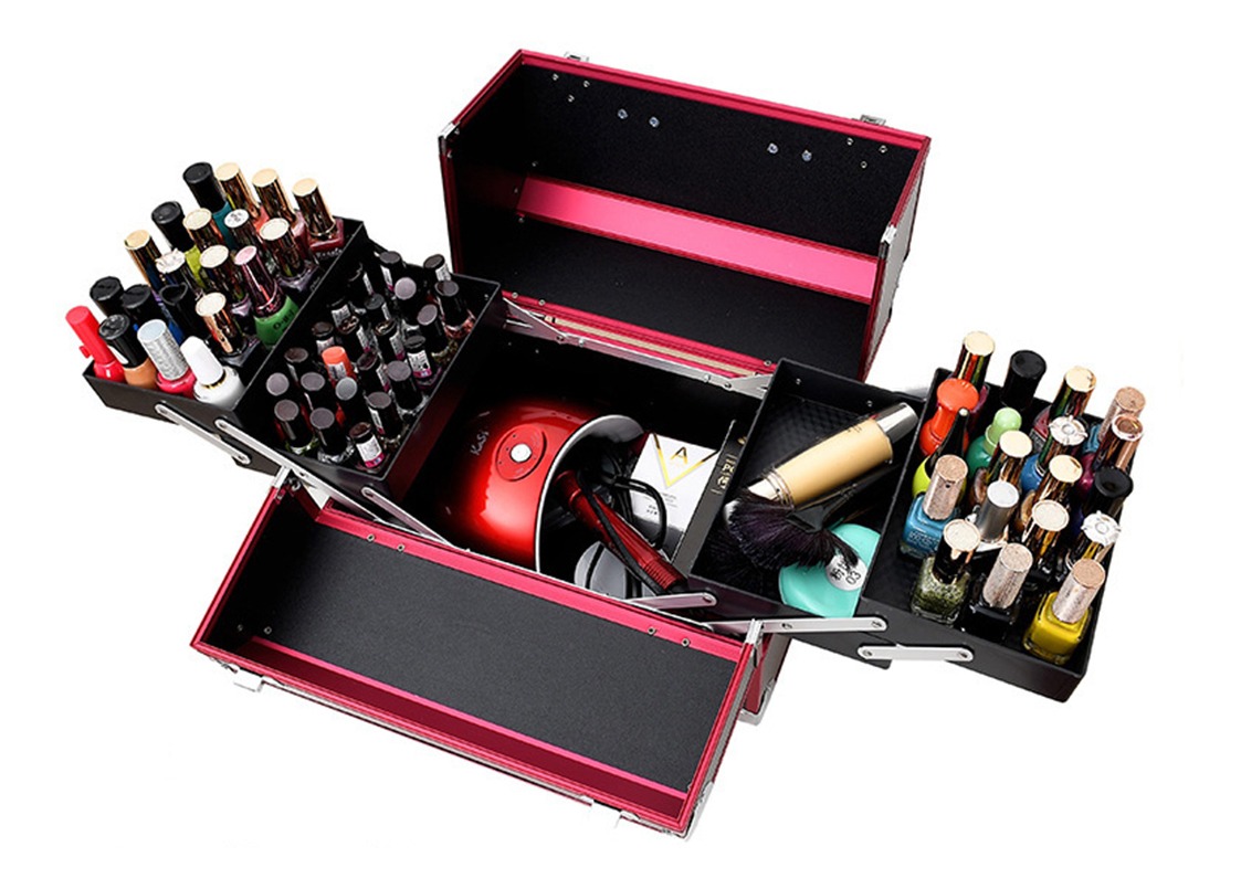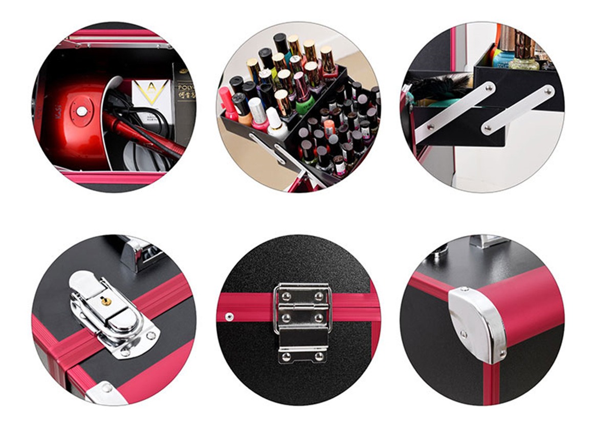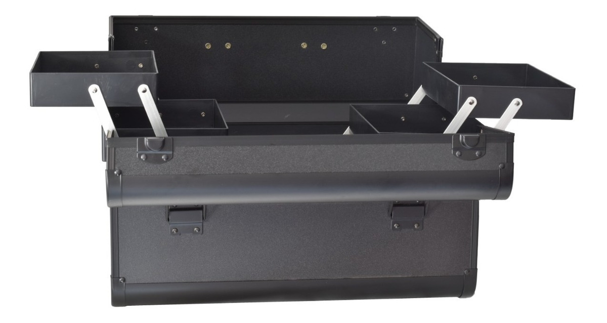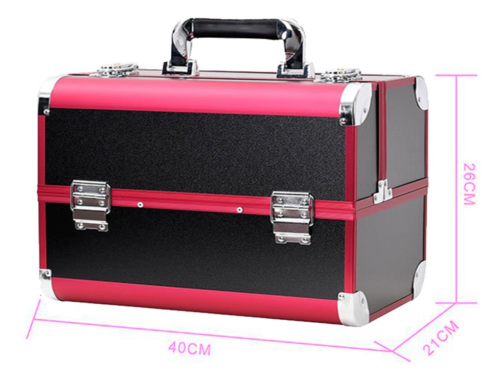Maleta para almacenamiento de cosméticos, compartimentos superiores plegables con fácil acceso donde puede colocar esmaltes de tamaño pequeño , el compartimento inferior es ideal para almacenar artículos grandes. Material: abc, aluminio y pc. La maleta incluye un juego de llaves. El color del artículo puede ser levemente diferente al de las imágenes que se muestran, esto puede ser por causa de muchos factores como el brillo de su monitor y el brillo de la luz.