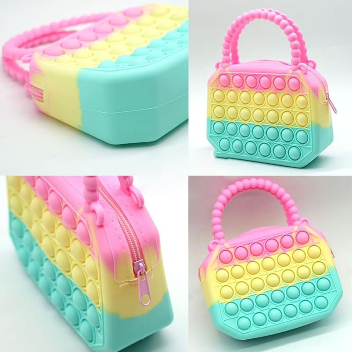 ¡La mini cartera Pop It más divertida y colorida! Este bolsito infantil está fabricado en goma Pop It, perfecto para que los niños se diviertan mientras se desestresan. Con un diseño multicolor y animado, es ideal tanto para niñas como para niños. Además de ser un accesorio práctico para llevar pequeñas pertenencias, ¡también ofrece horas de entretenimiento al presionar sus burbujas! Ideal para regalar a los más pequeños.