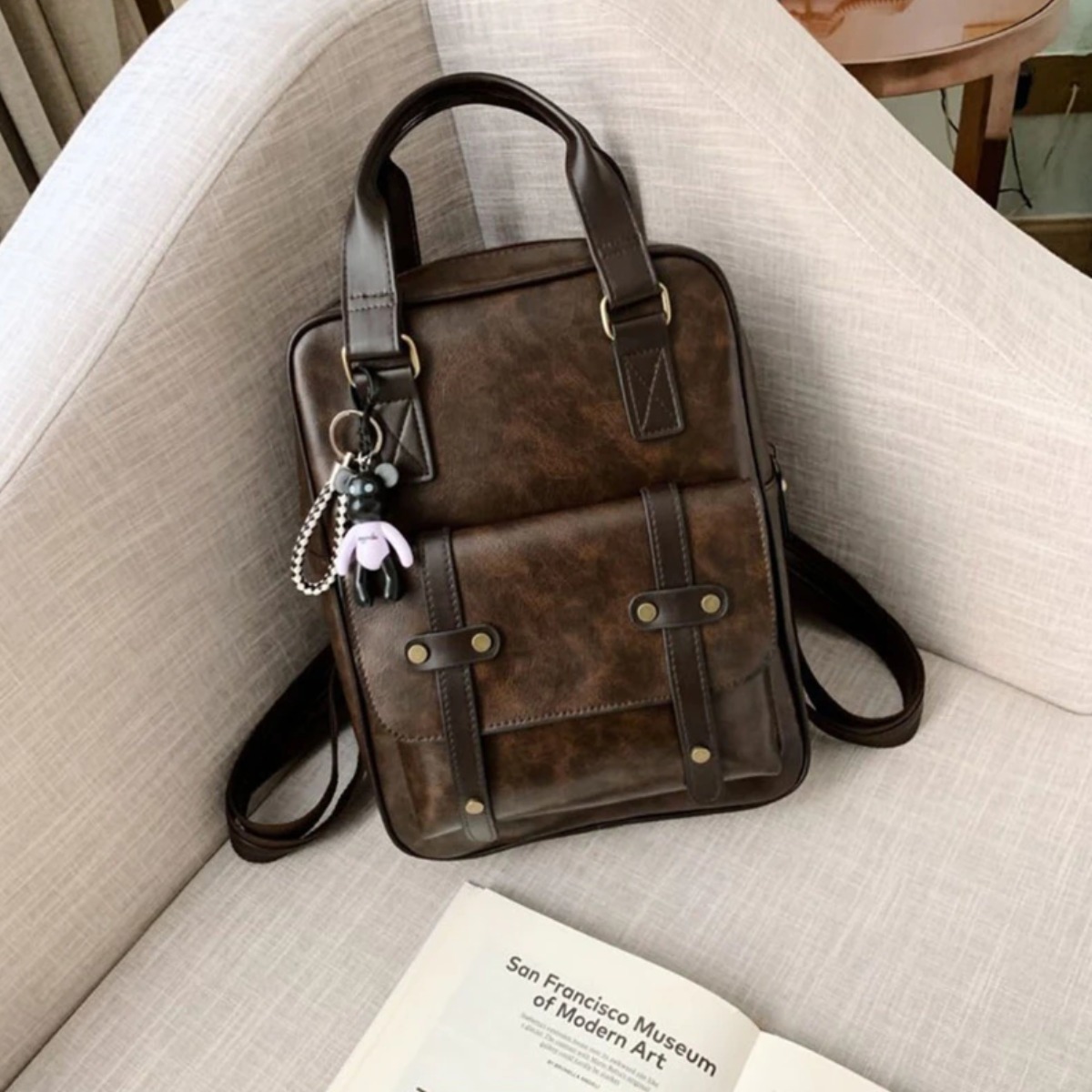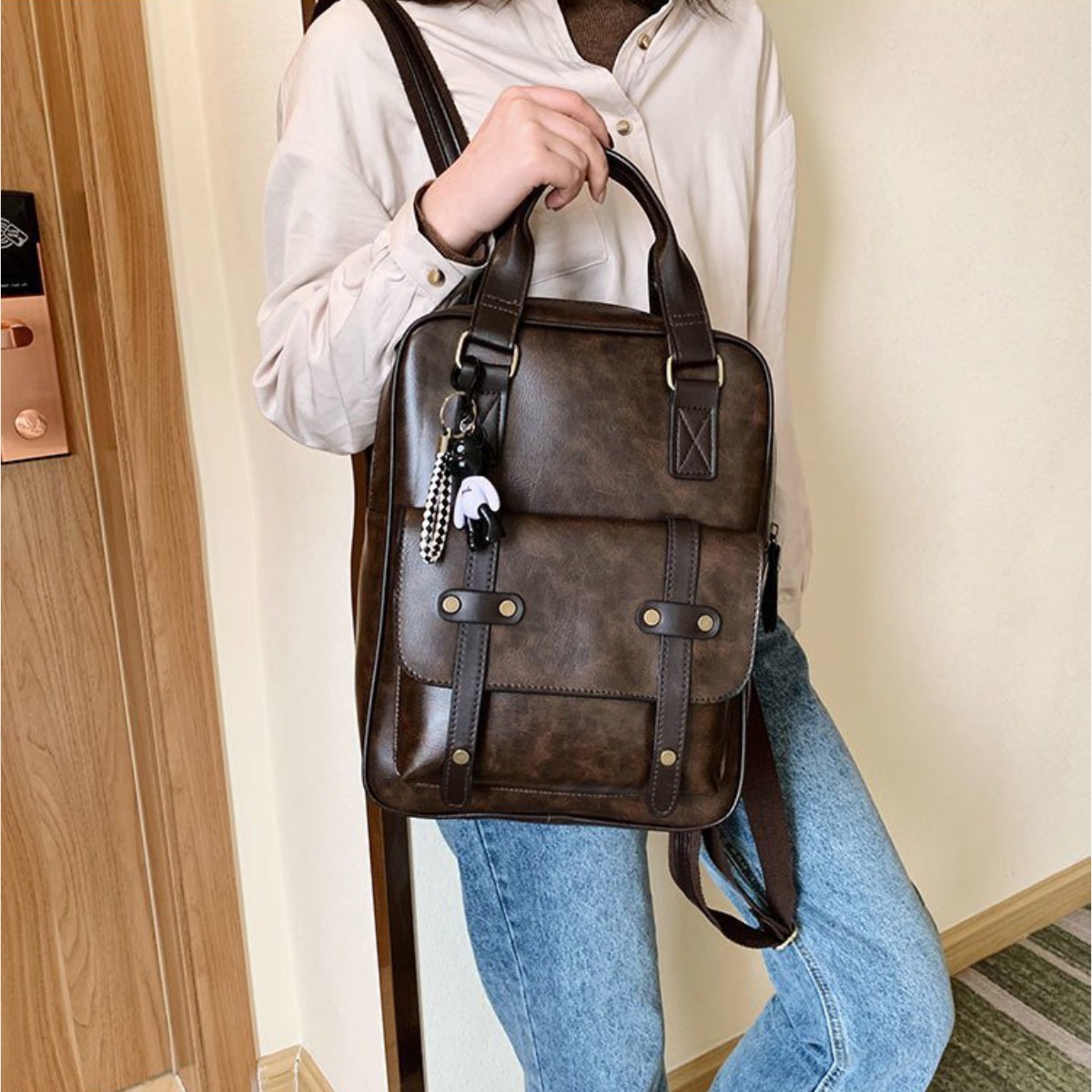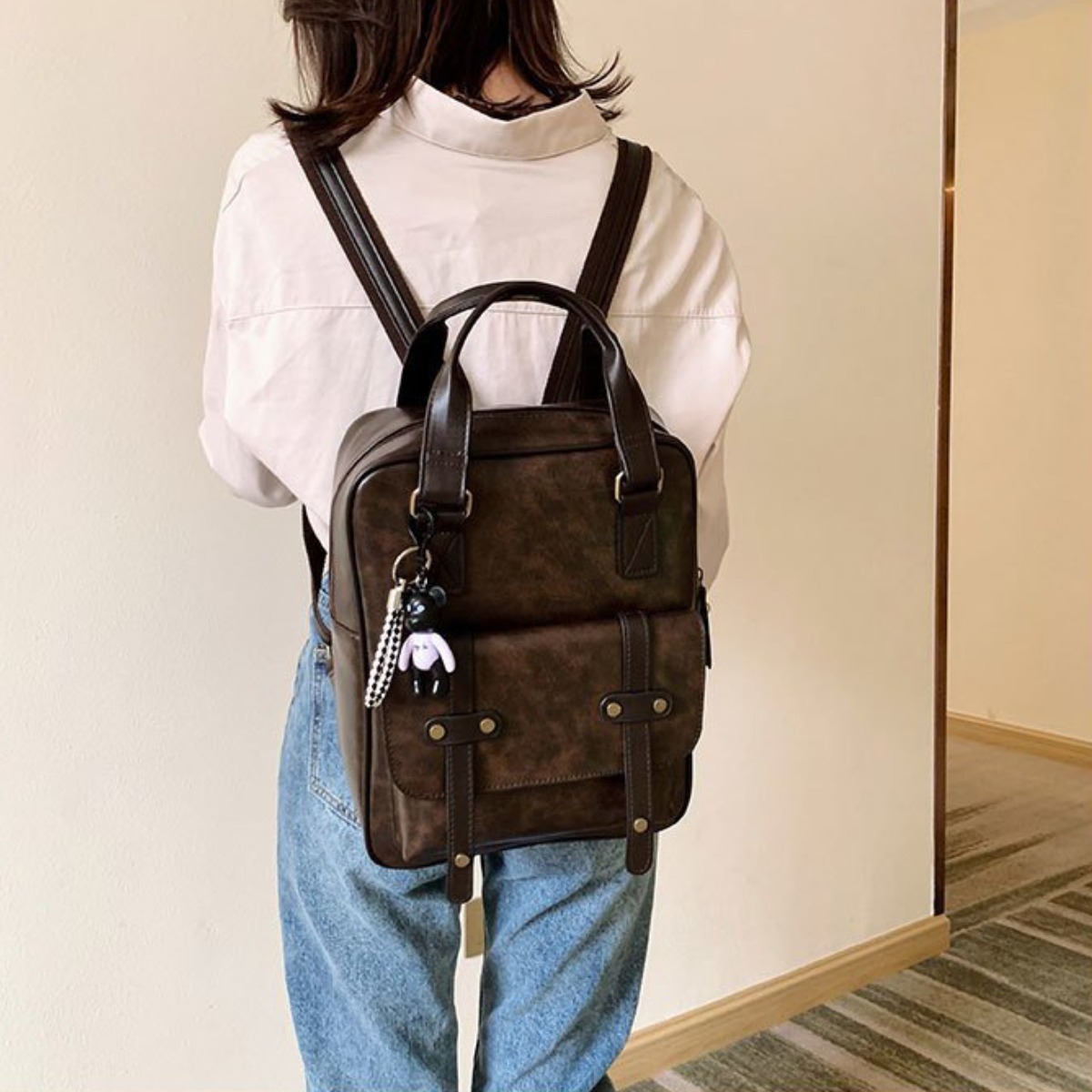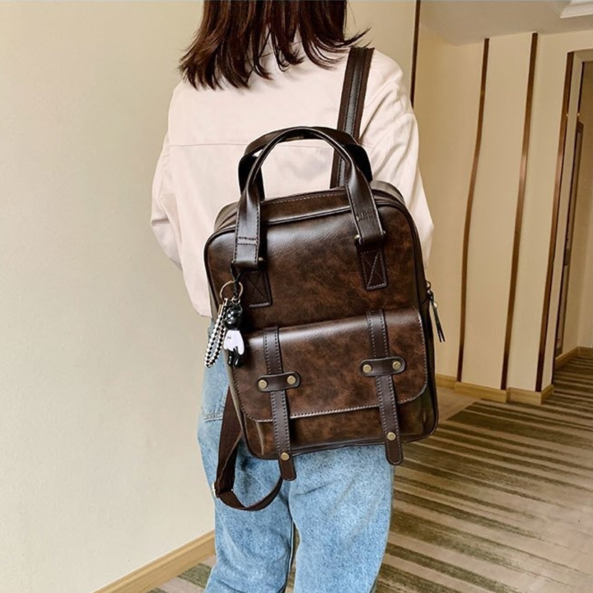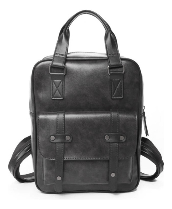 Mochila estilo retro vintage con un bolsillo principal con cierre y un bolsillo secundario con botones metálicos. Doble asa para llevarla como bolso de mano, o correas para usar como mochila.