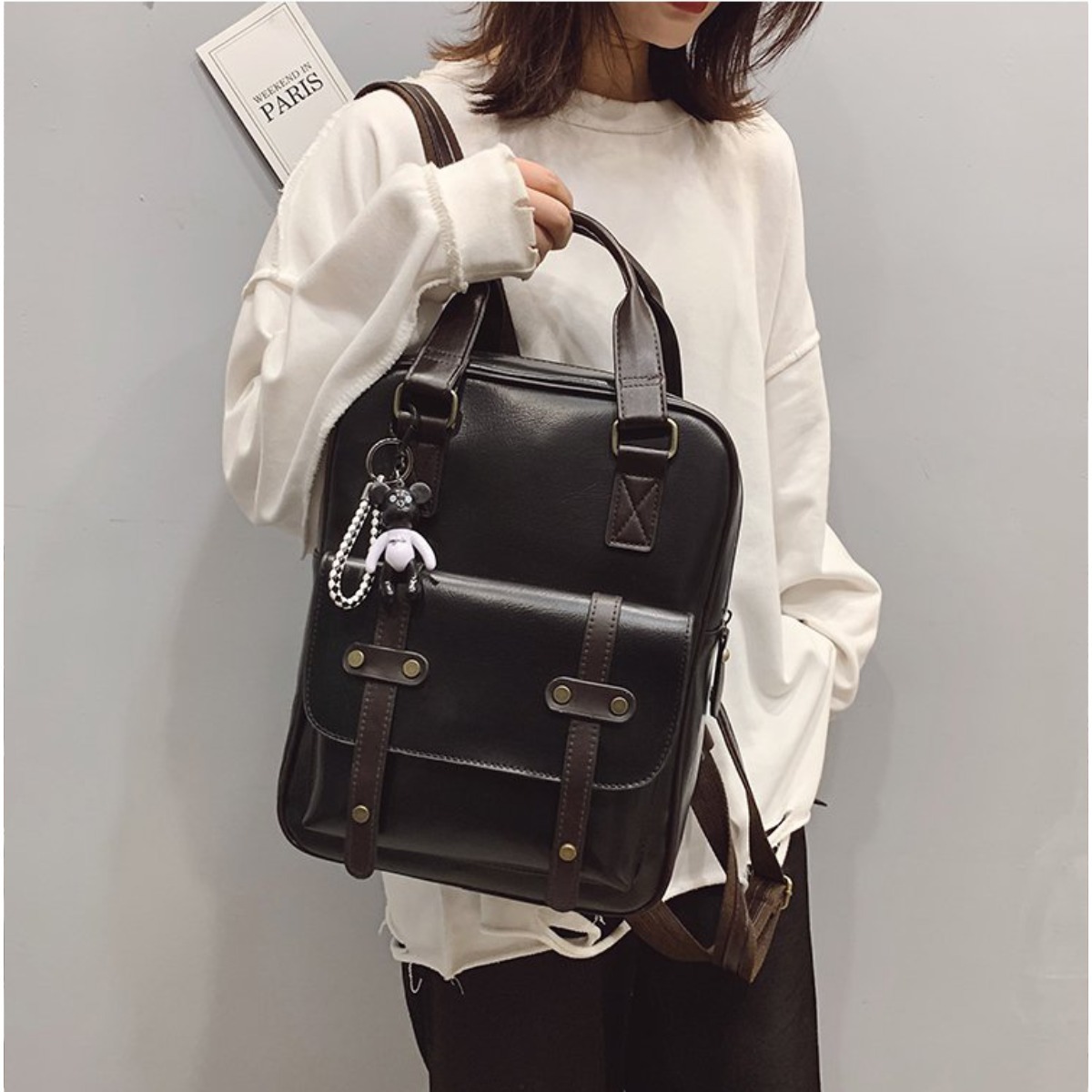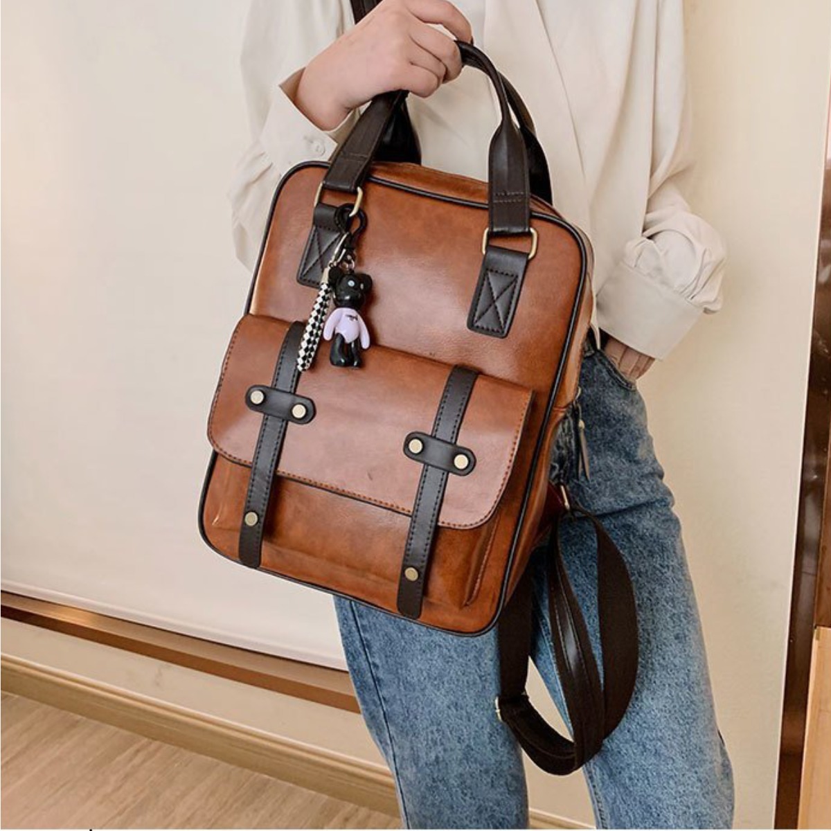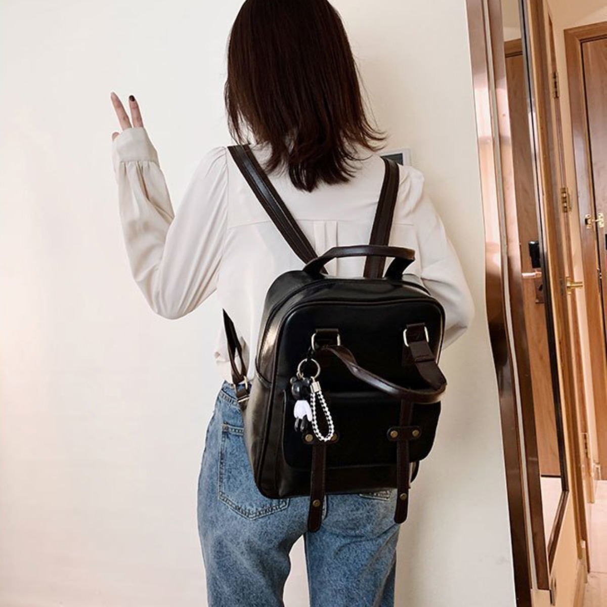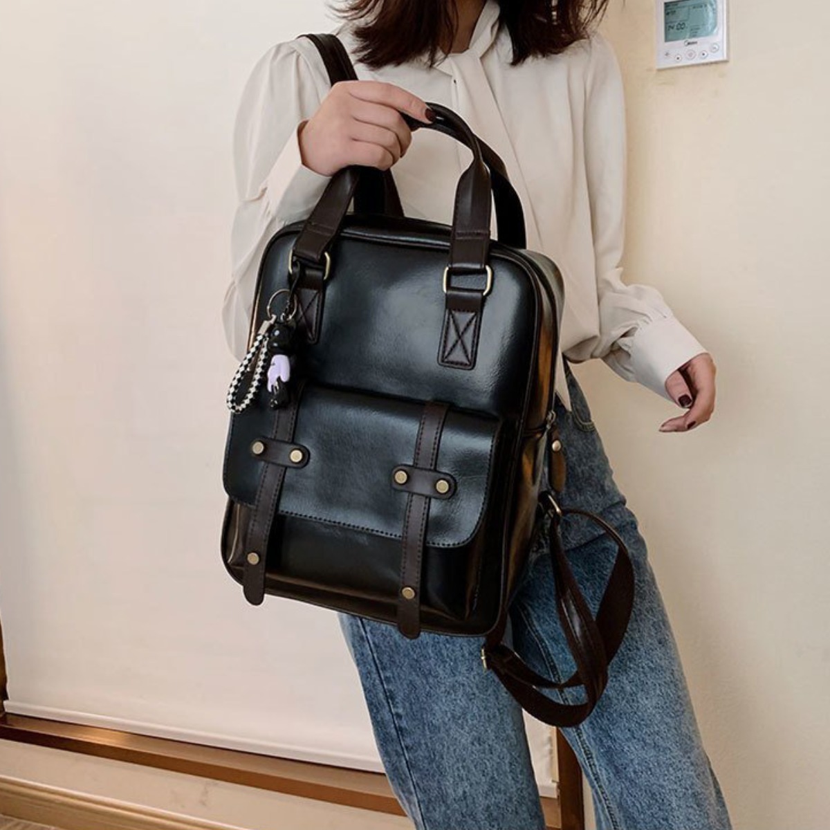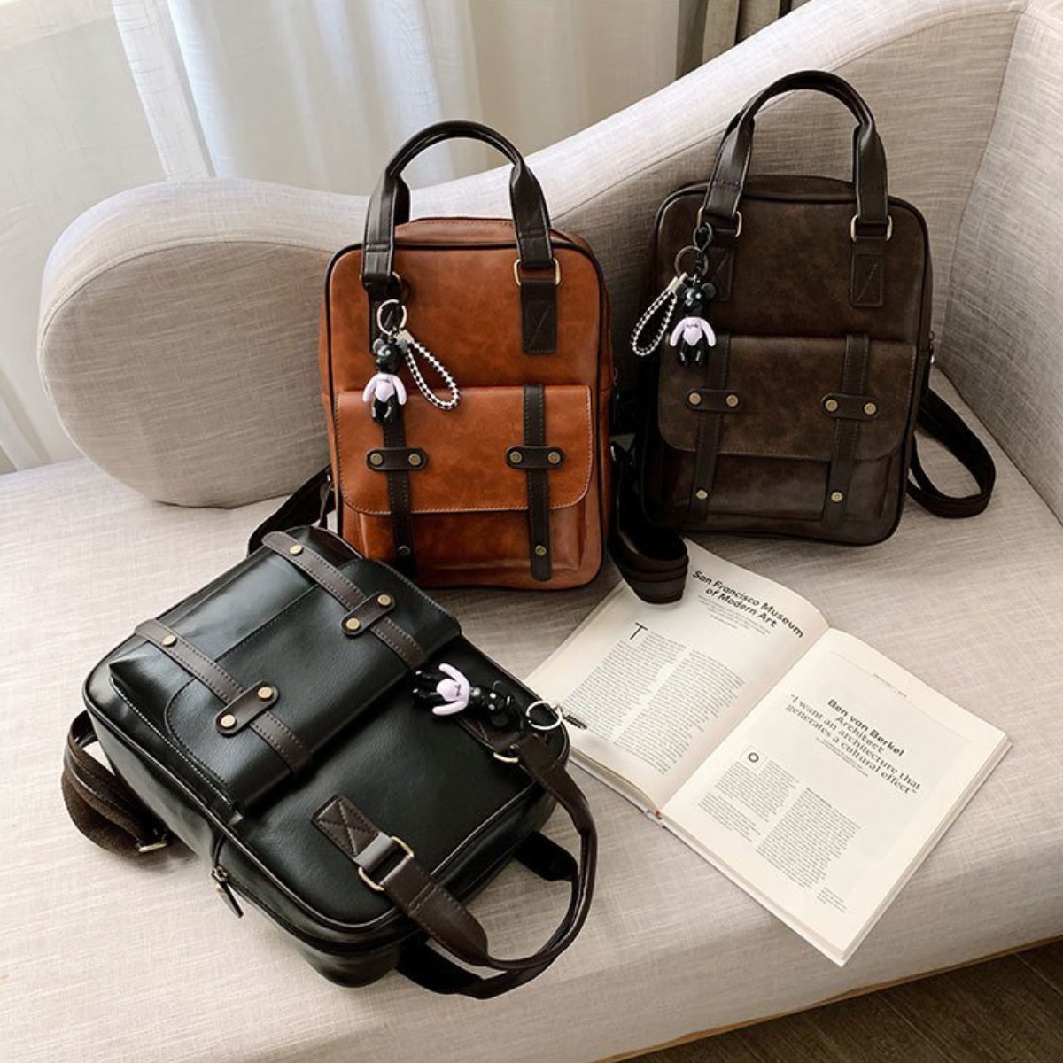 Mochila estilo retro vintage con un bolsillo principal con cierre y un bolsillo secundario con botones metálicos. Doble asa para llevarla como bolso de mano, o correas para usar como mochila.