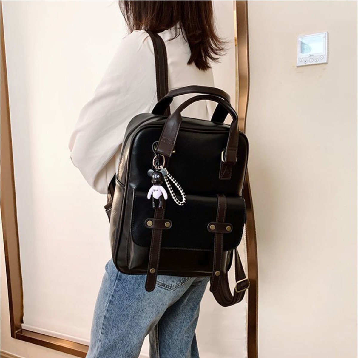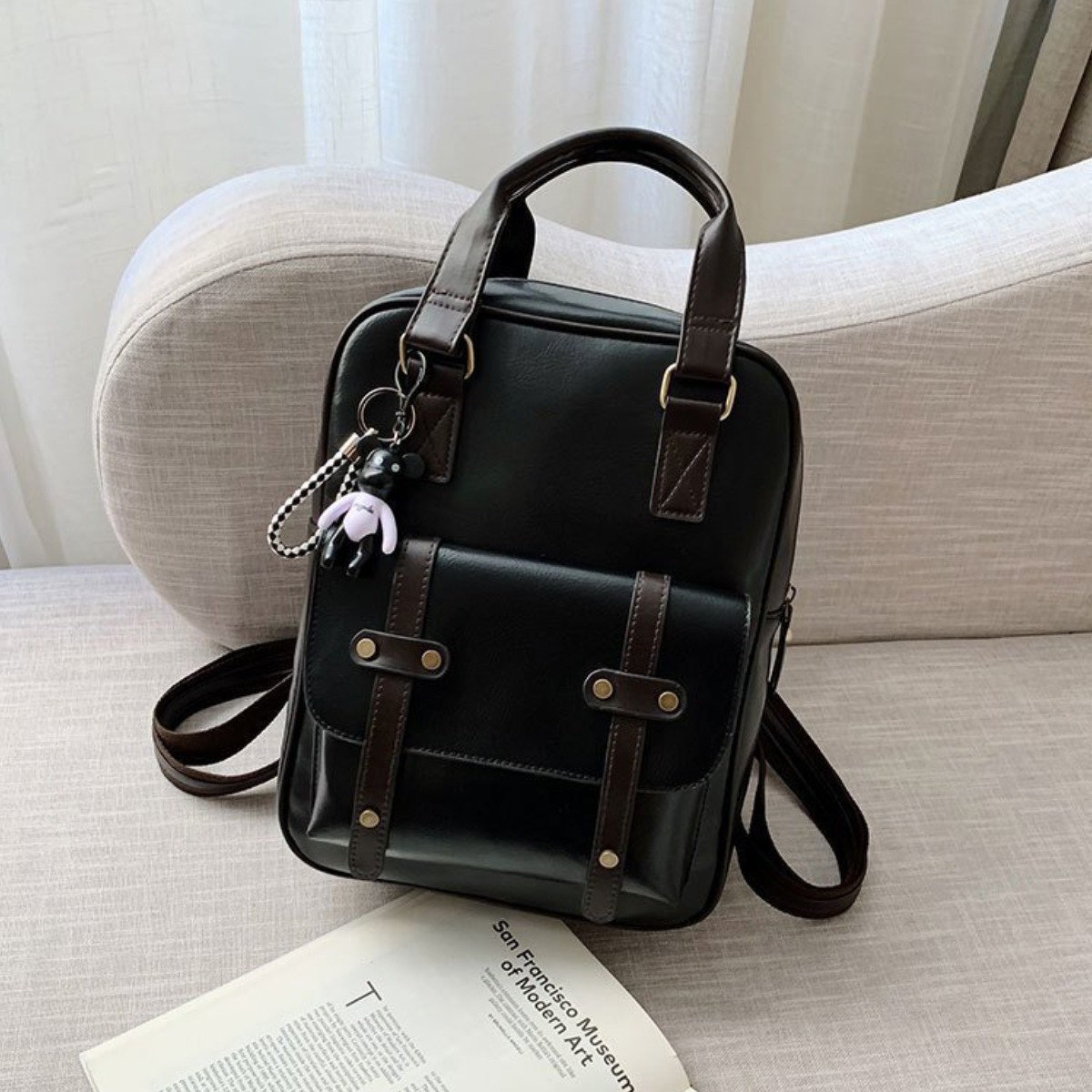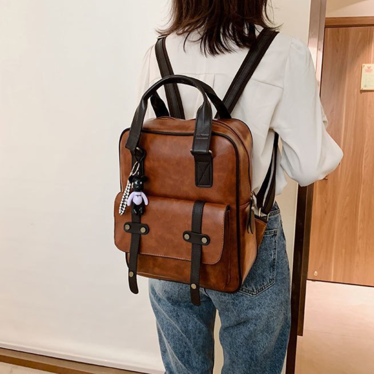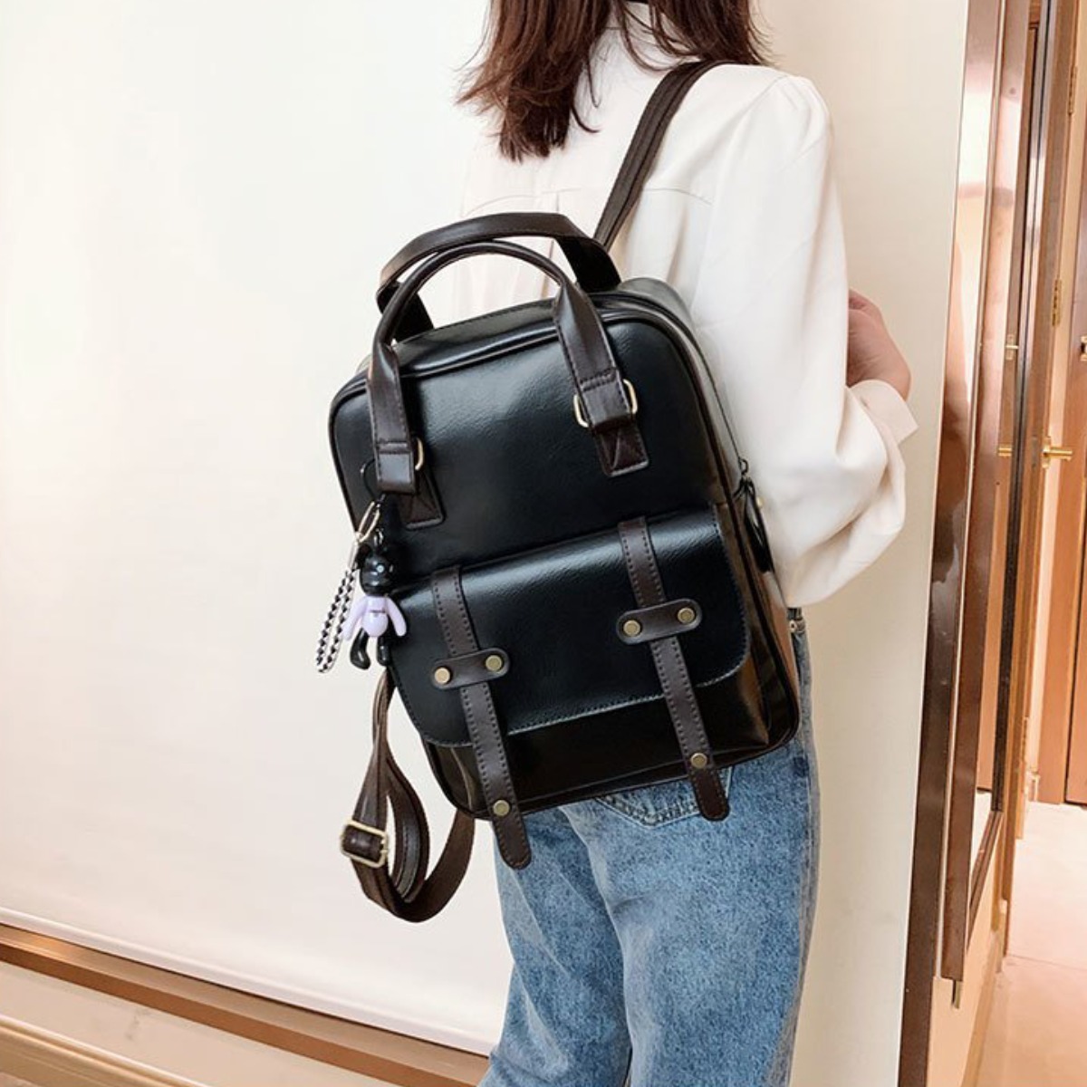 Mochila estilo retro vintage con un bolsillo principal con cierre y un bolsillo secundario con botones metálicos. Doble asa para llevarla como bolso de mano, o correas para usar como mochila.