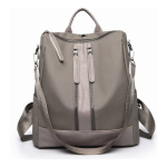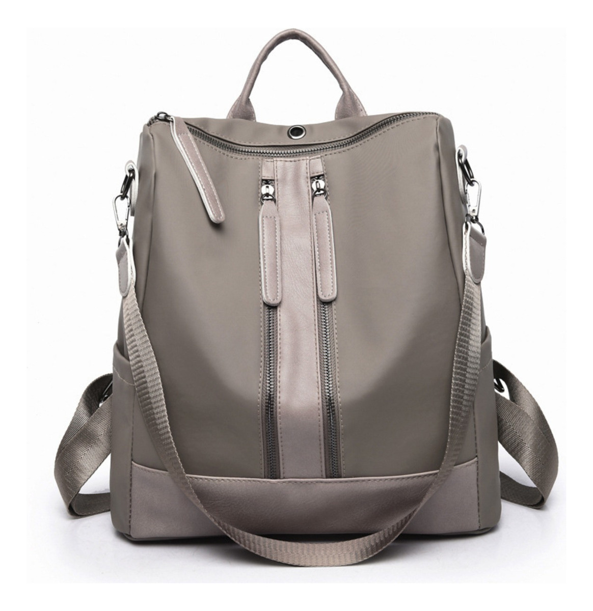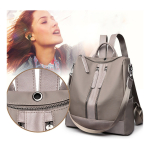 Mochila moderna en cuero sintético, de 34cm de largo y 27cm de ancho. Tiene 5 bolsillos exteriores y 4 interiores. Diseño antirrobo y correa ajustable para usar como mochila o cartera. Disponible en gris y negro.