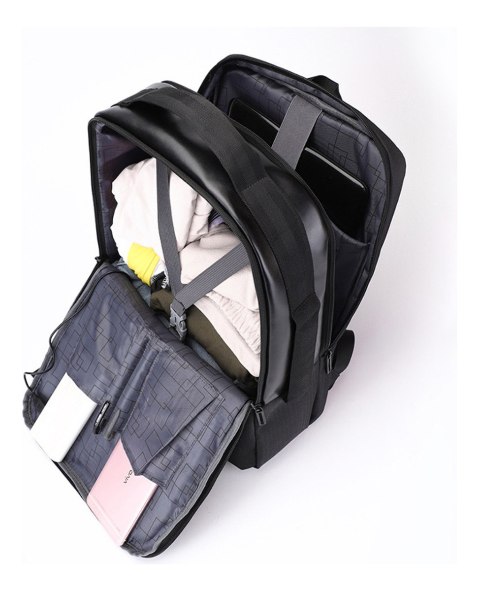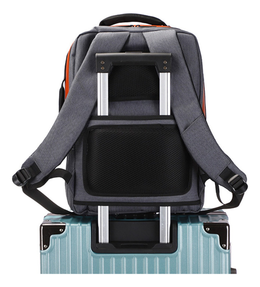 En la parte posterior, encontrarás una ranura para acoplar la mochila a una maleta de viaje, convirtiéndola en un versátil bolso de mano. También cuenta con un práctico slot semi oculto en la correa izquierda, perfecto para guardar tarjetas del ómnibus u otros pequeños objetos. Y no olvidemos el conector USB en el lado izquierdo, que te permitirá conectar tu propio PowerBank y cargar tu celular mientras te desplazas.
