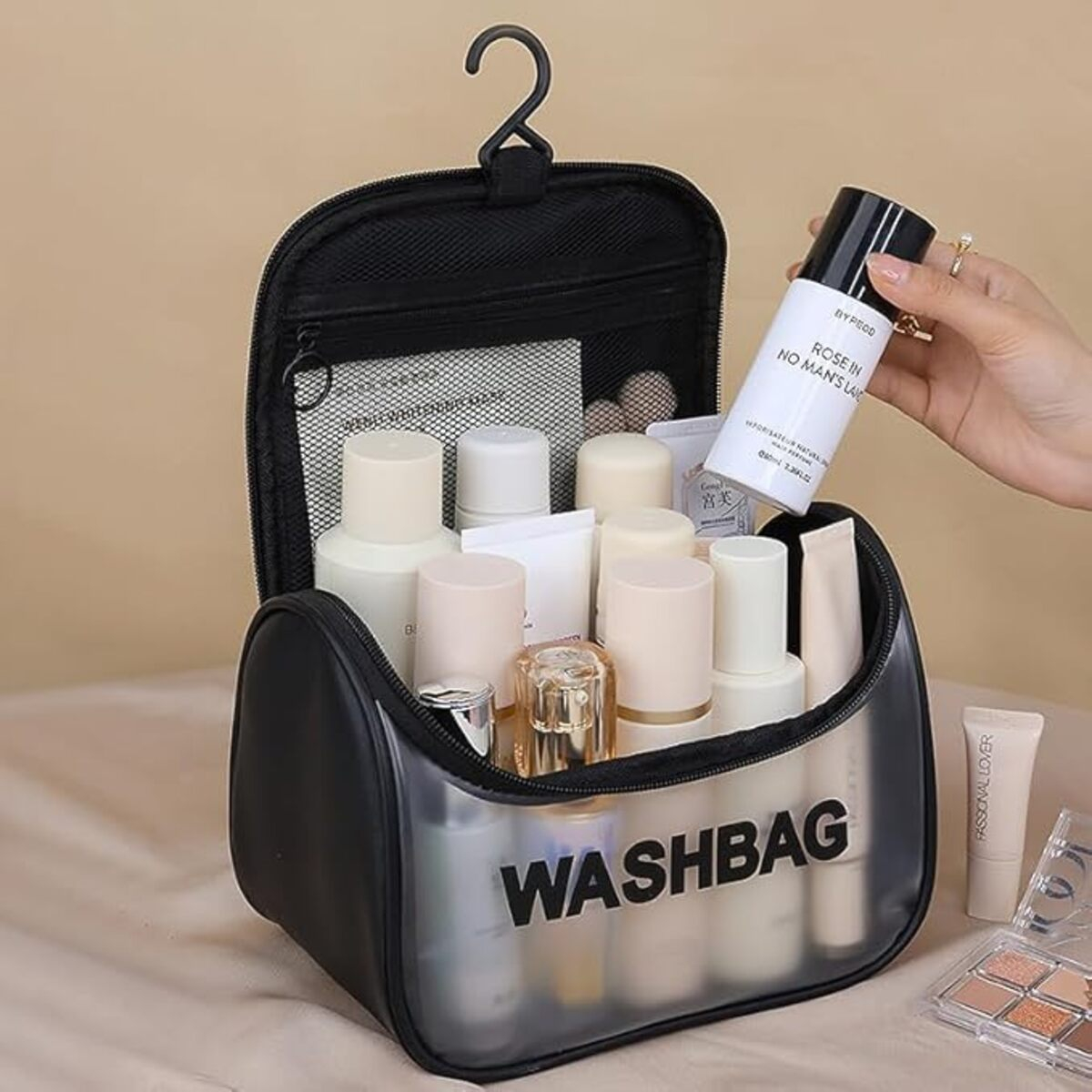 El compartimento principal es amplio y espacioso, perfecto para guardar botellas, cremas, maquillaje y otros productos de cuidado personal. Para una organización adicional, incluye bolsillos de malla internos ideales para pinceles, brochas o pequeños accesorios. También incorpora un práctico gancho que permite colgarlo cómodamente en el baño o en cualquier lugar, optimizando el espacio disponible.