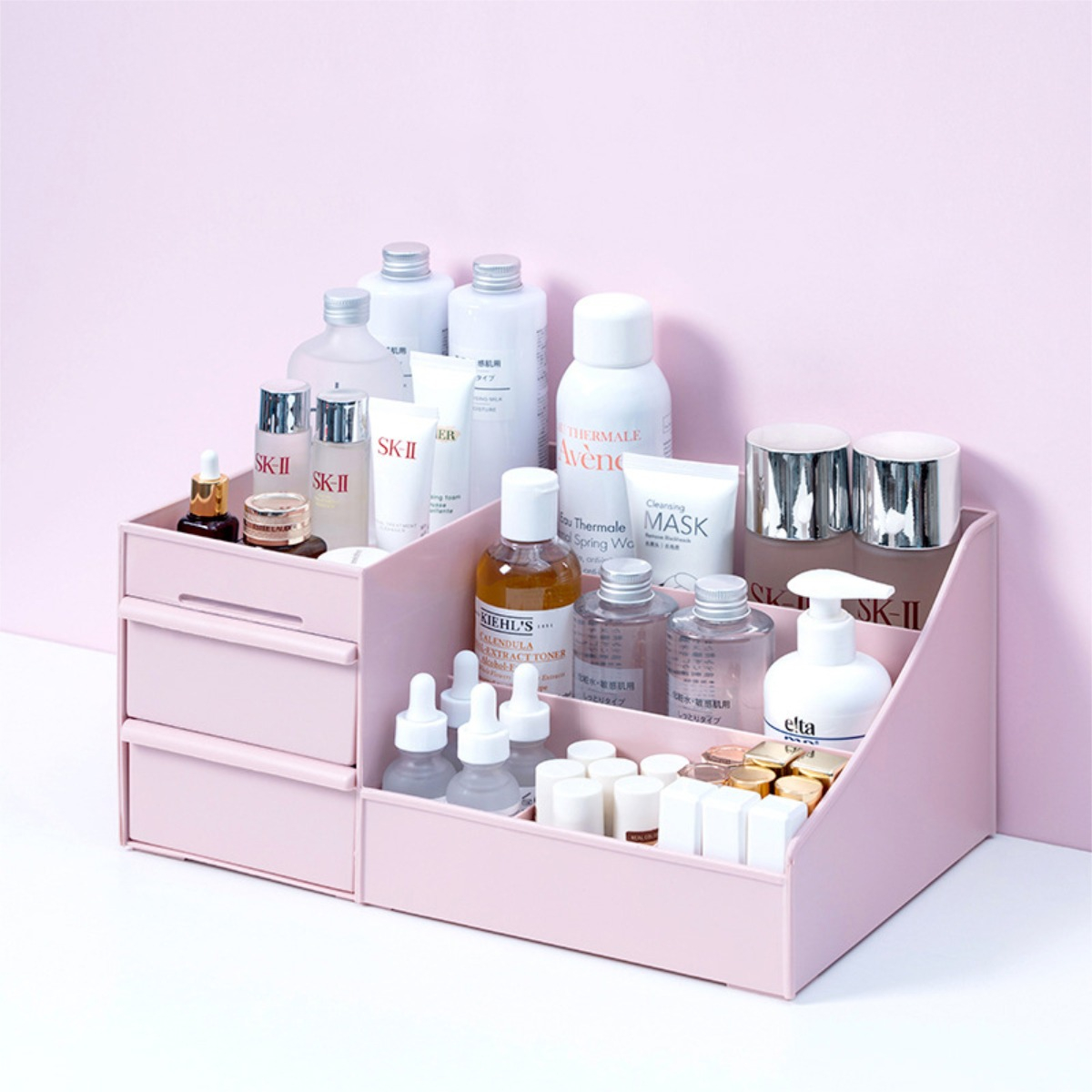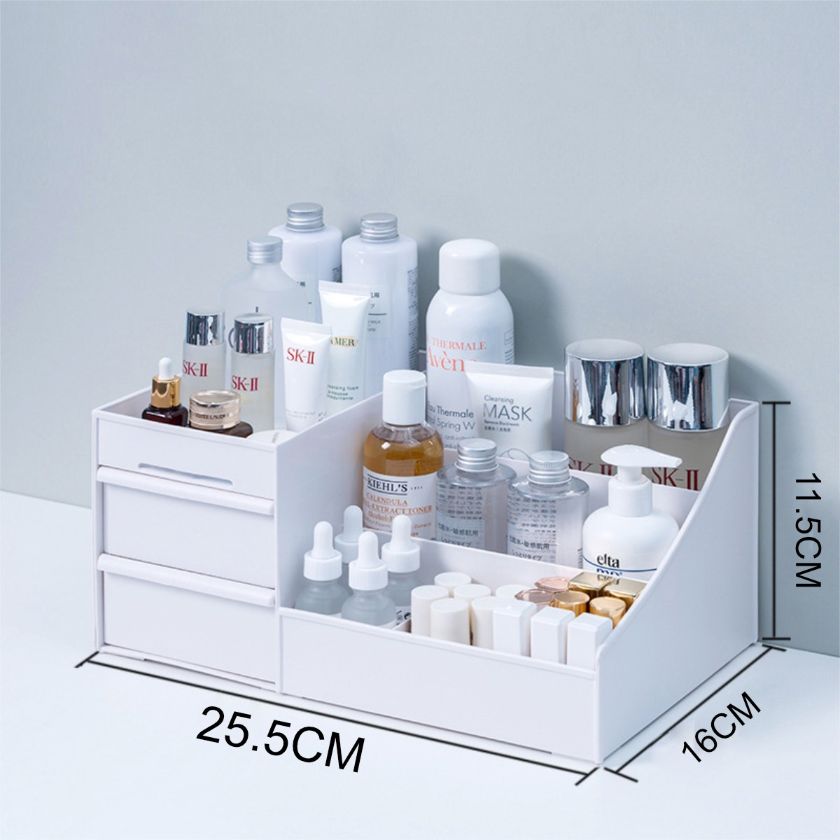 Descripción: Este organizador está diseñado para ayudarte a ahorrar espacio y mantener tus productos perfectamente ordenados. Con una gran capacidad y múltiples compartimentos, este organizador es ideal para cualquier tocador, proporcionando un acceso fácil y un almacenamiento ordenado.