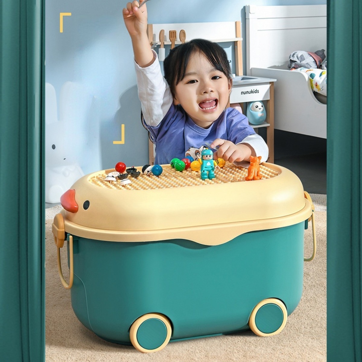 Una forma fácil y divertida de enseñar a los más pequeños a mantener el orden. Este práctico baul organizador para juguetes o ropa no sólo tiene gran capacidad, sino que además es súper divertido porque viene con rueditas y asa para llevarlo como carrito; y además soporta el peso suficiente para que tu niño pueda subirse!