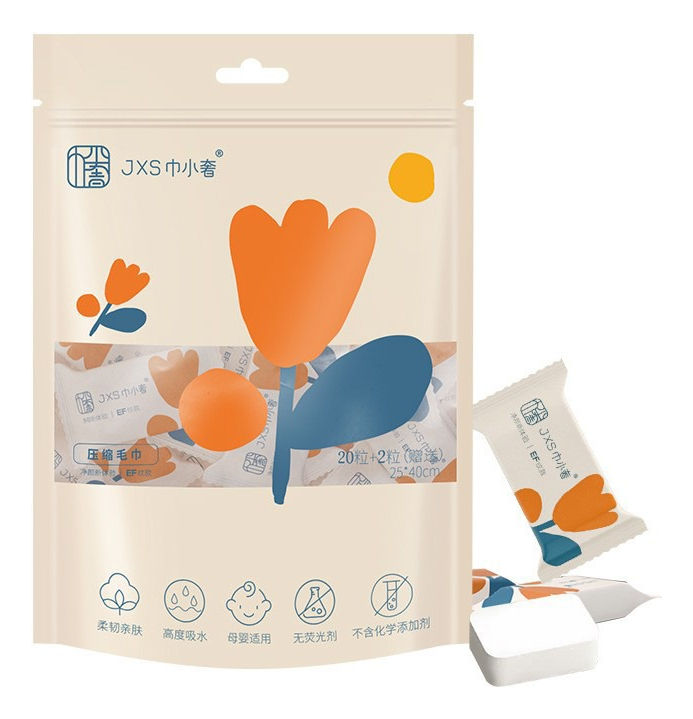 pack x 12 de toallas faciales comprimidas. Al momento de entrar en contacto con el agua se descomprimen revelando una toalla facial de hasta 40 cm de largo.