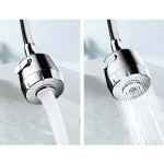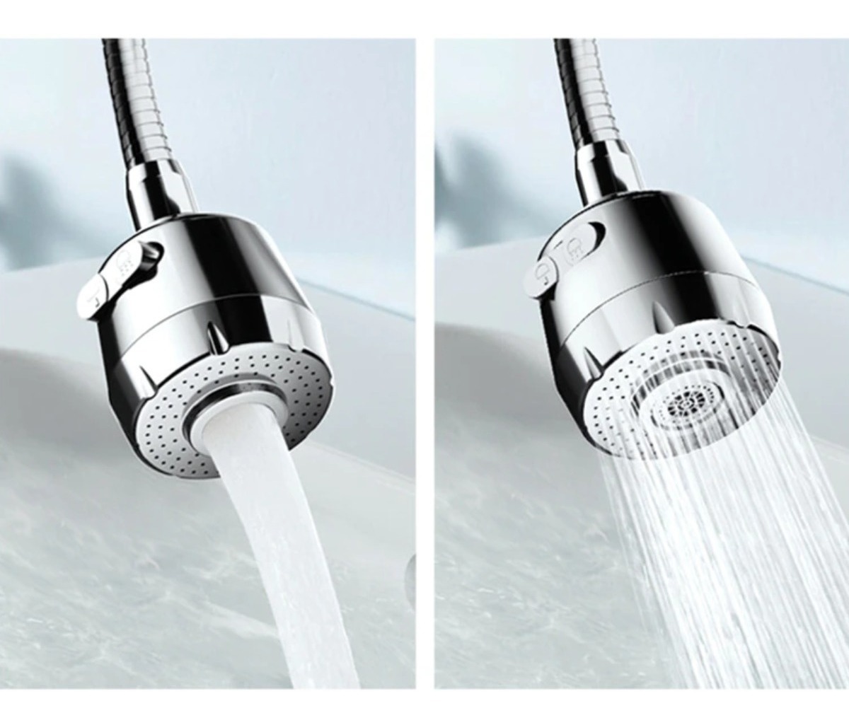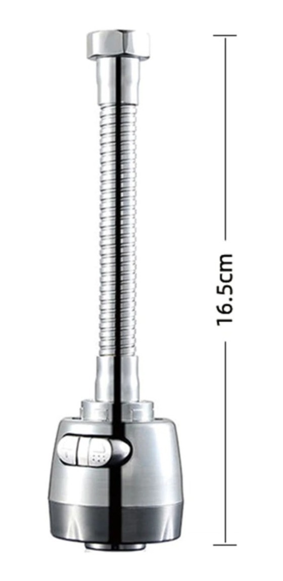 Práctico extensor para los grifos de cocina o baño, que permite dirigir sin problemas el agua para una limpieza más facil, asi como alternar entre chorro directo o lluvia. Medidas aprox 16cm x 4cm aprox y boquilla conectora de tamaño universal.