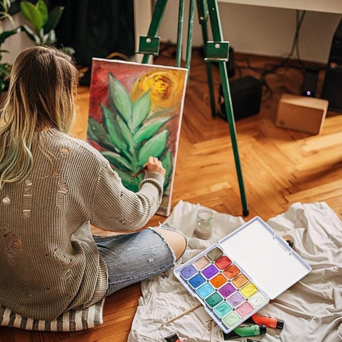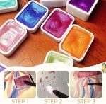 Juego de acuarelas metálicas en formato sólido, que incluye 18 colores vibrantes y un pincel. Perfecto para crear efectos brillantes y luminosos en tus obras de arte. Estas acuarelas de alta calidad ofrecen una excelente pigmentación y se disuelven fácilmente en agua, permitiendo una aplicación suave y uniforme. Ideal para artistas, estudiantes y aficionados a la pintura, tanto en proyectos escolares como en actividades creativas. Incluye un pincel para facilitar su uso.
