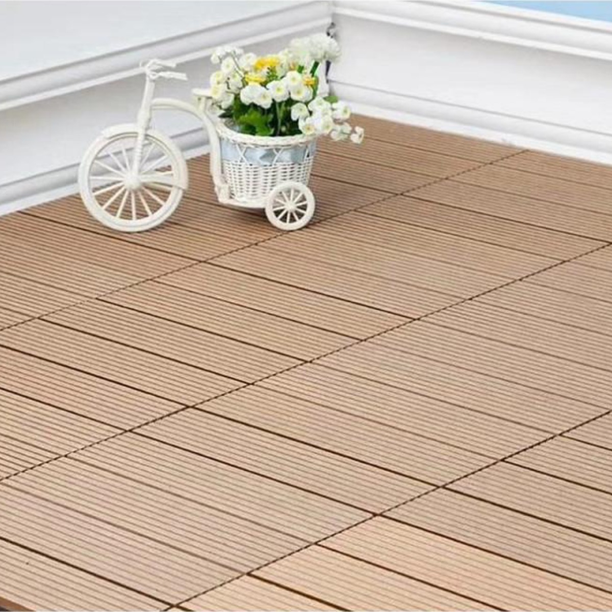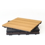 La superficie tiene el aspecto natural a textura de madera, es impermeable y antideslizante y gracias a sus separaciones no acumula agua, haciendolo más seguro para caminar mientras esté mojado; la rejilla inferior, donde se encuentra el sistema de encastres, está fabricada en un plástico denso y fuerte lo que extiene la vida útil del piso.