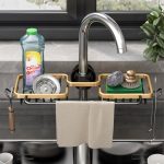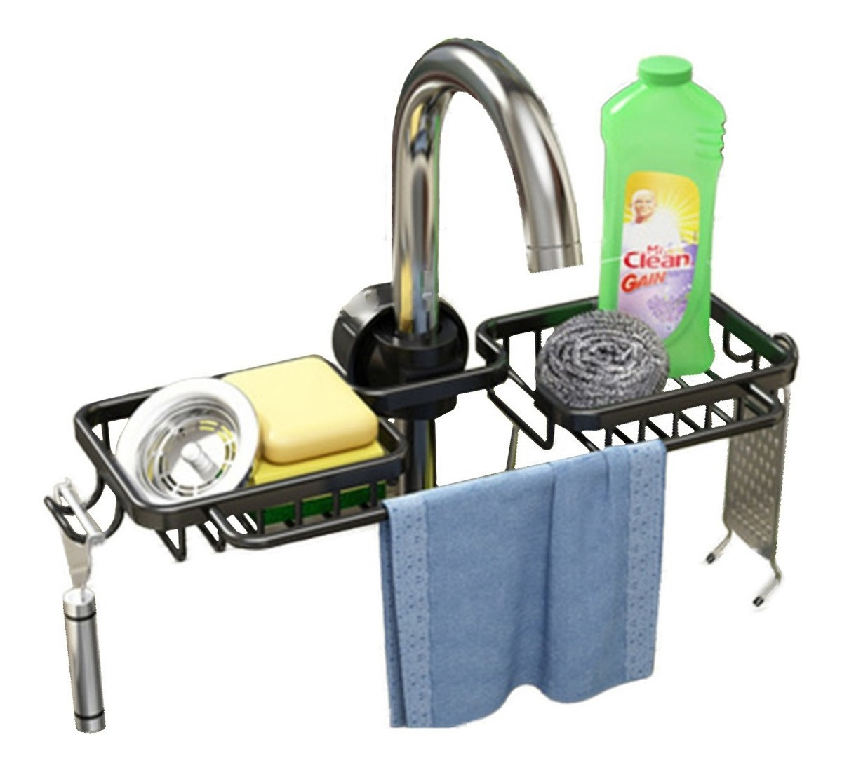 Soporte para esponjas y paños, se acopla a la canilla, fácil de colocar y de quitar para una más simple limpieza.