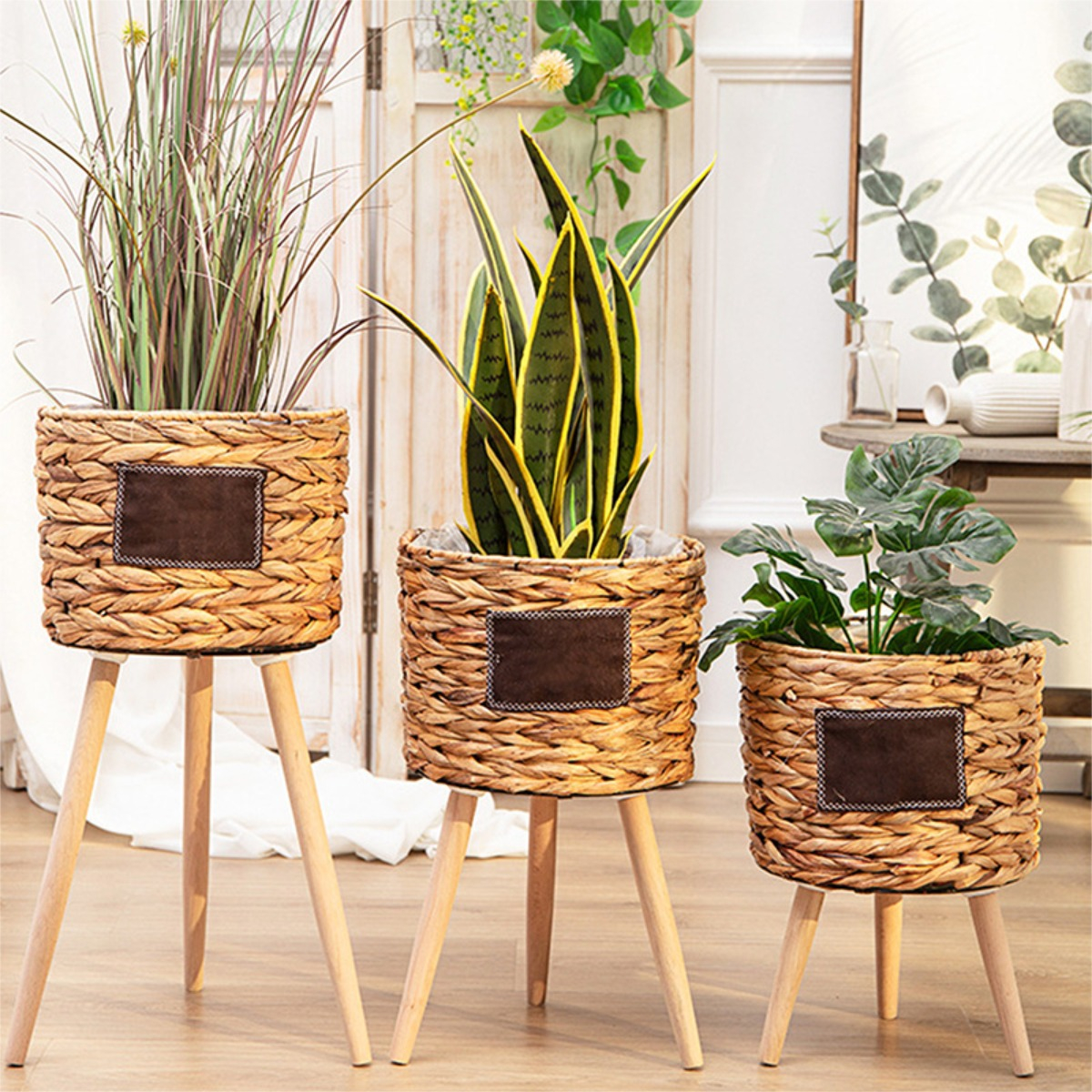 Portamaceta estilo boho en bambú y mimbre ideal para crear un ambiente ameno y esconder esas feas macetas de toda la vida. Cuenta con recubrimiento plástico interno para evitar que se humedezca. Para regar las plantas se recomienda quitar la planta de este portamaceta y una vez regada y drenada, volver a colocar. No plantar directamente.