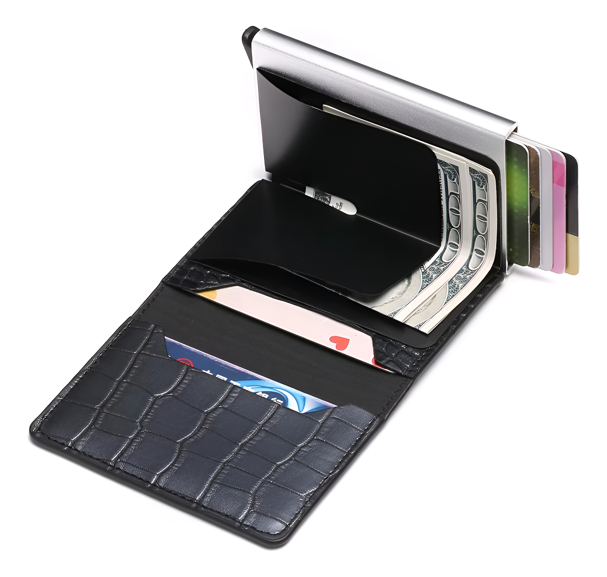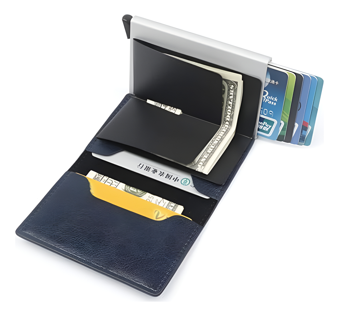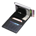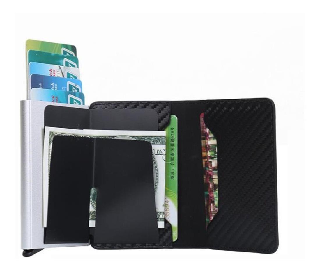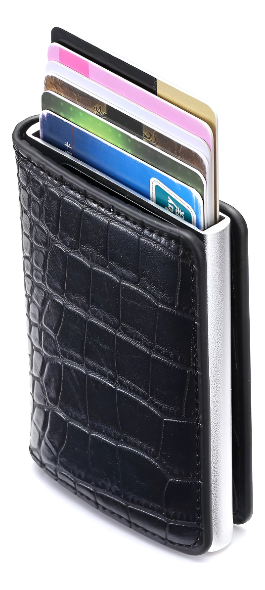 Elegante y práctico porta tarjetas diseñado en cuero sintético con protección RFID para mayor seguridad de tus datos. Incluye un compartimento metálico que permite extraer tus tarjetas con facilidad, espacio para billetes y documentos. Ideal para mantener tus pertenencias organizadas y protegidas.