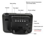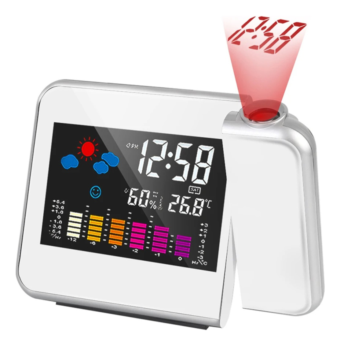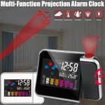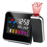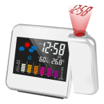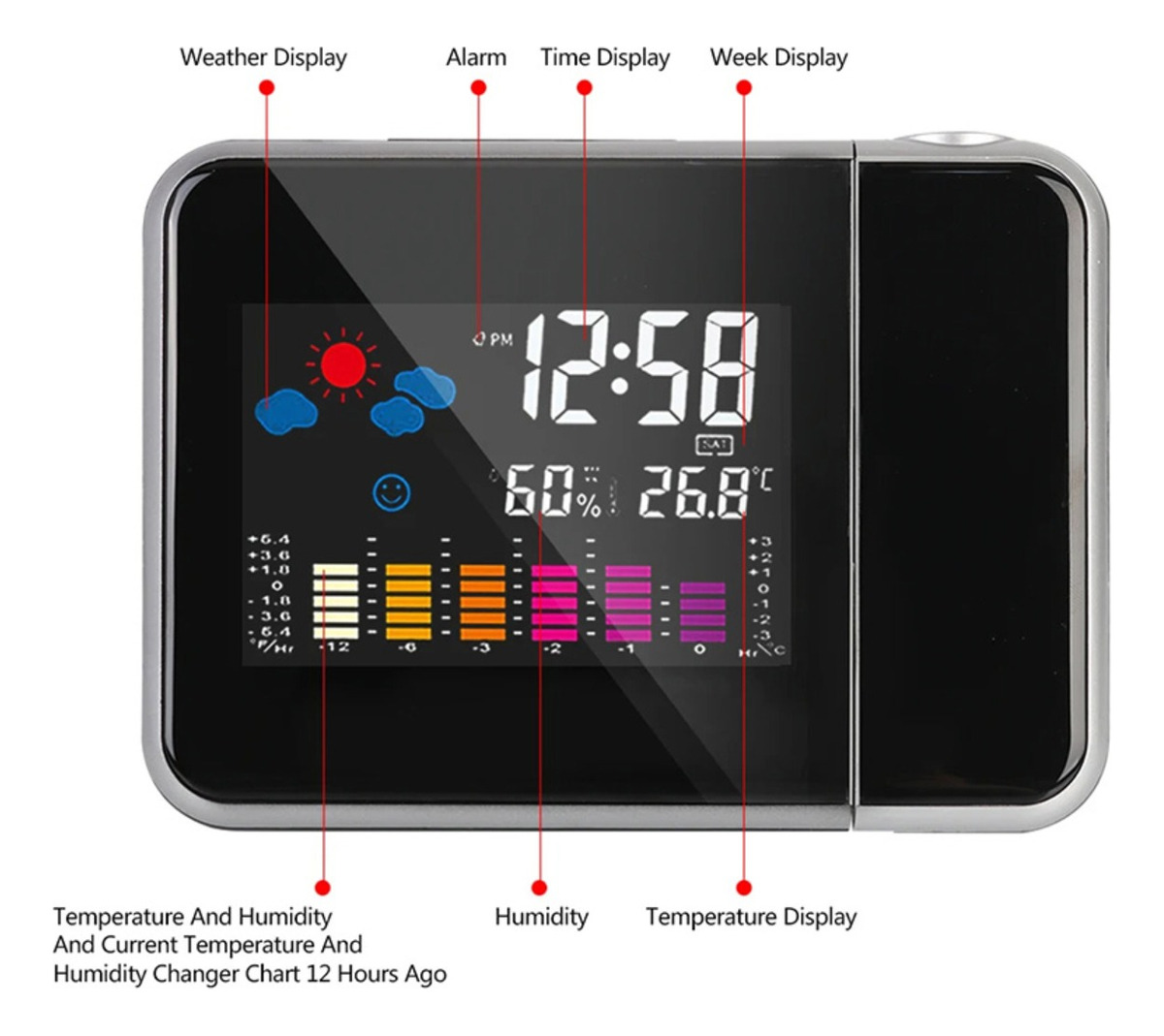 Reloj despertador de mesa con un innovador laser proyector con capacidad de rotación de 180 grados. El reloj cuenta con: Horario, Calendario, Medidor de temperatura, humedad y clima.