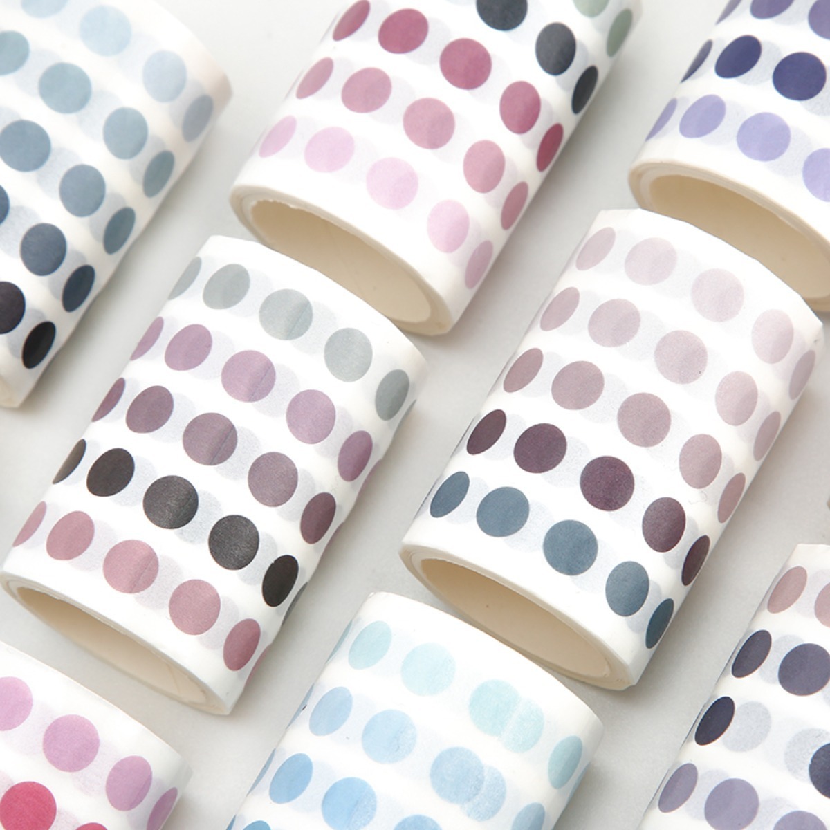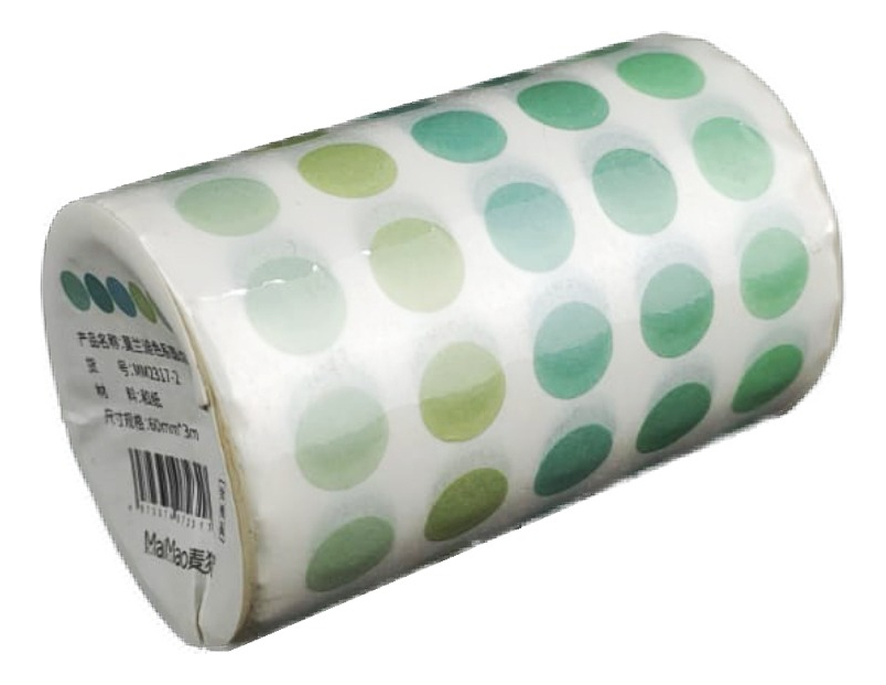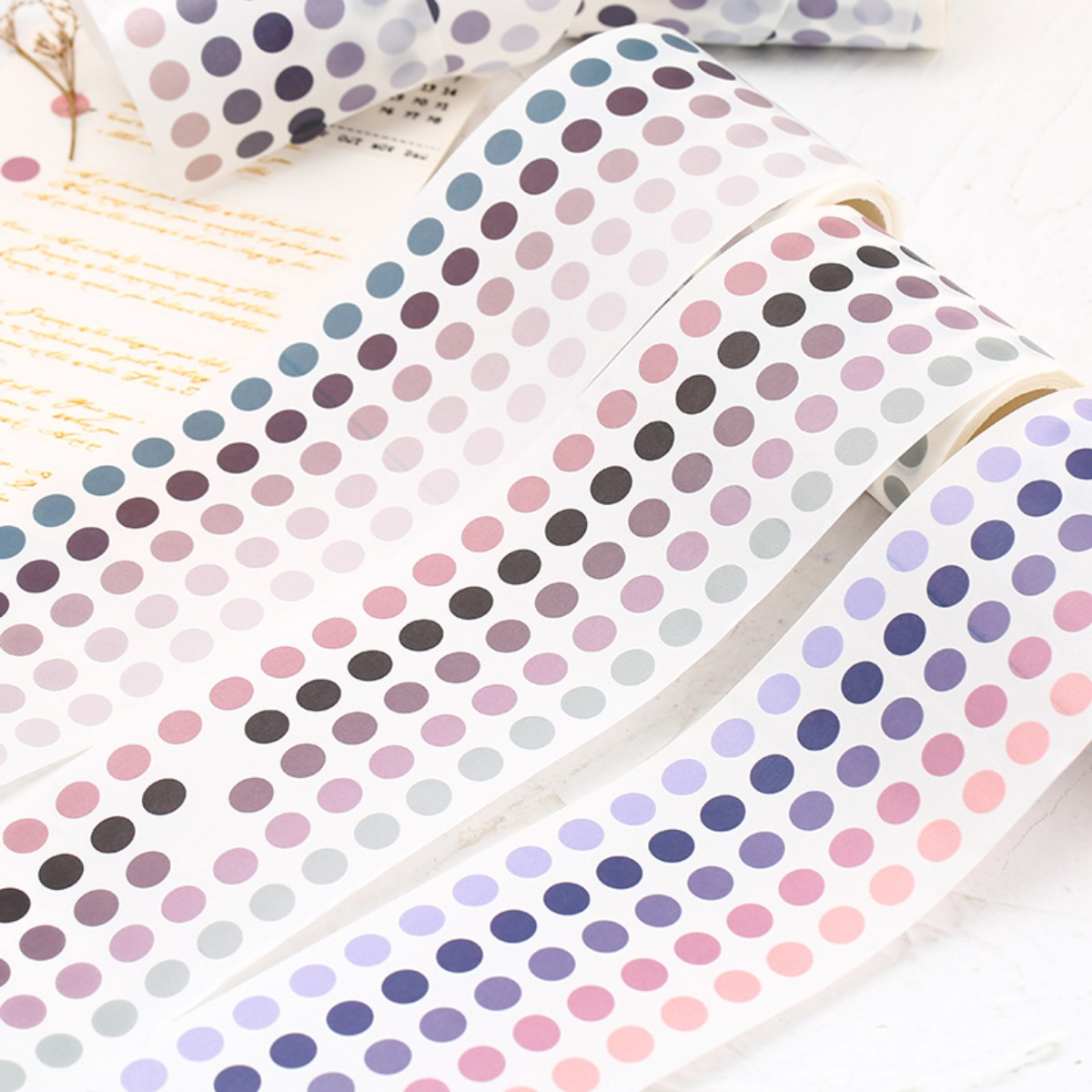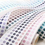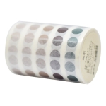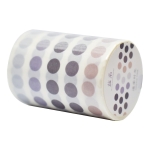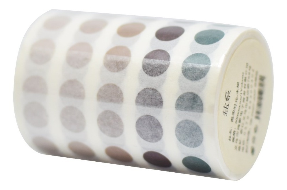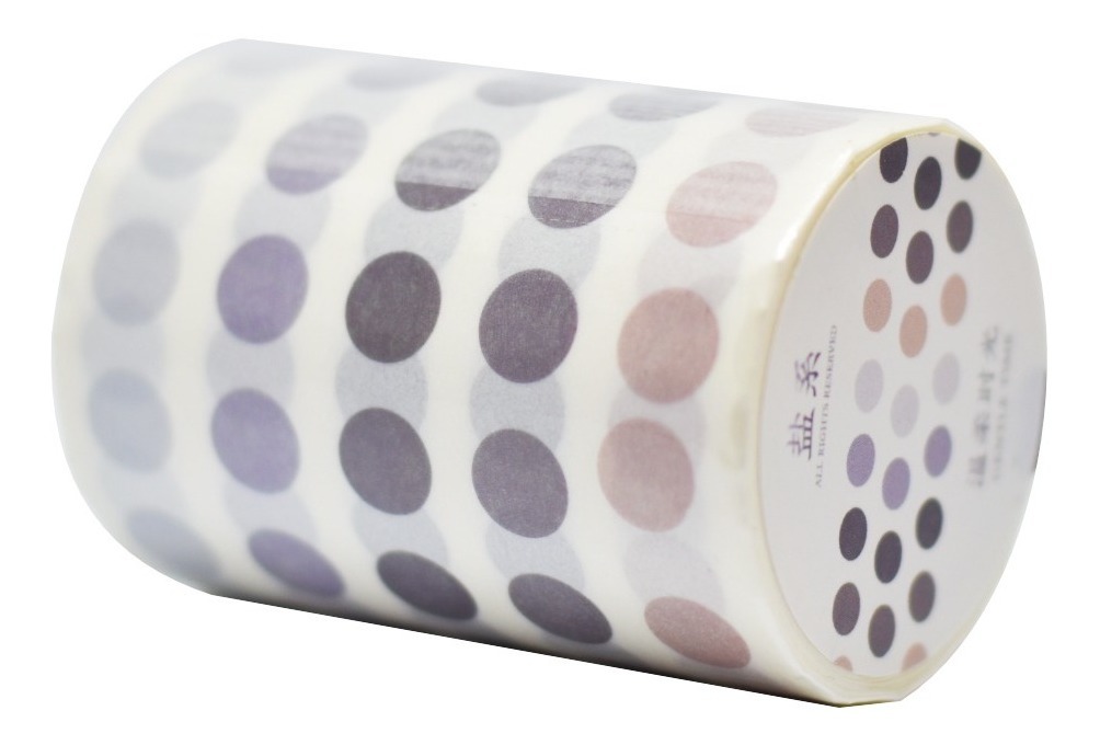 Rollo de 3 m de largo x 6 cm de ancho con más de 1300 stickers circulares de 5 tonos distintos, cada sticker tiene un diámetro aproximado de 7 mm, el tamaño cercano a un renglón de cuaderno.