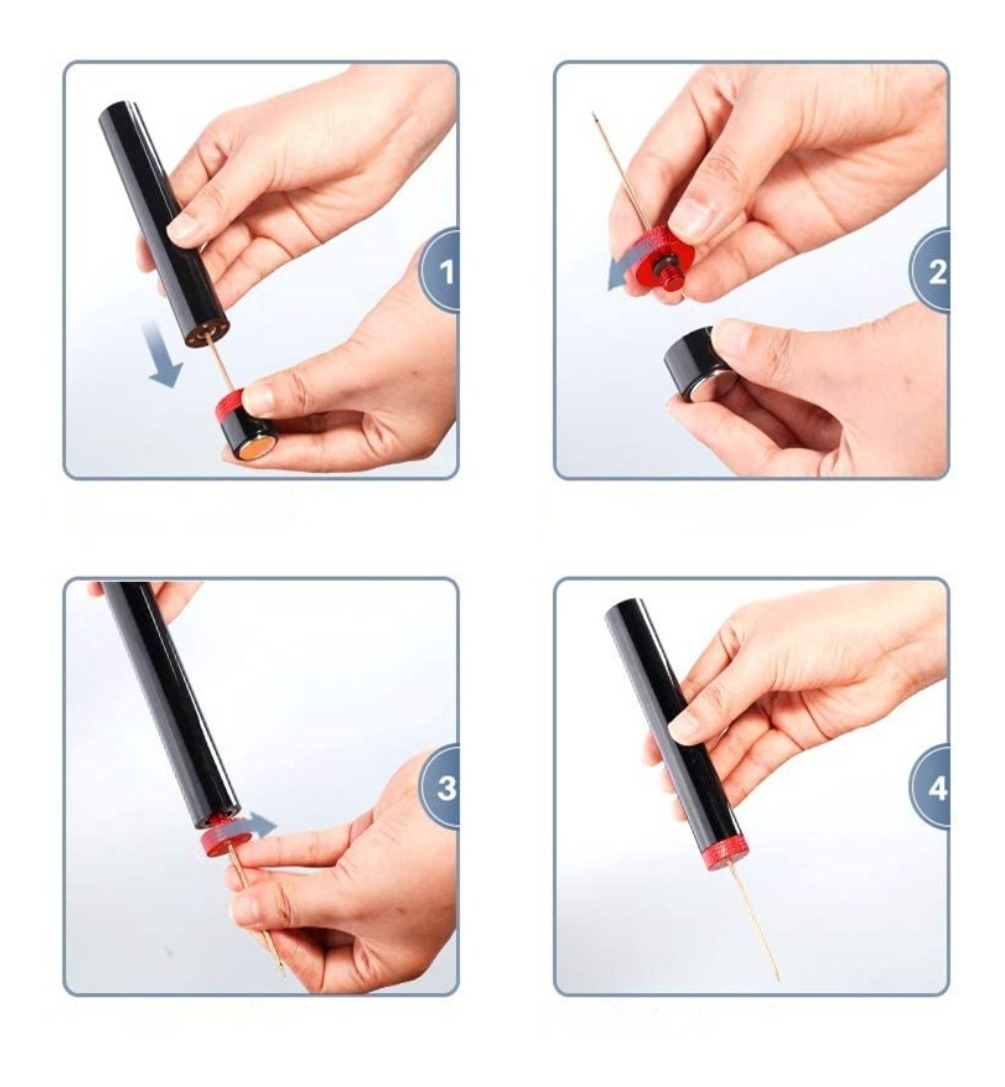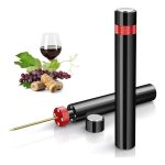 Sacacorchos de vino con bomba de aire de alta eficiencia para una apertura más rápida de la botella, No es necesario girar ni hacer esfuerzo, simplemente deslice la aguja y accione la bomba de aire varias veces, el corcho comenzará a salir sin ningún daño. En comparación con otros, este sacacorchos puede quitar limpiamente el corcho y evitar que el mismo se rompa y contamine el vino. El sacacorchos de vino utiliza una aguja de metal afilada que se puede deslizar perfectamente en el centro del corcho para un desmontaje completo. Después del uso, la aguja se puede guardar dentro del sacacorchos para evitar roturas de la misma o lesiones accidentales. Ligero, compacto y elegante. Material ABS Tamaño: 2x14cm Peso: 45g