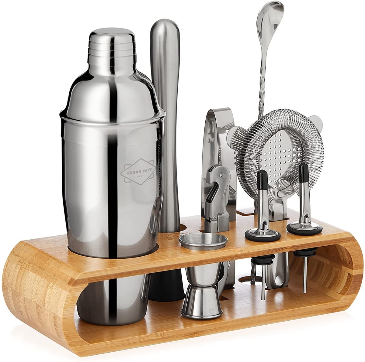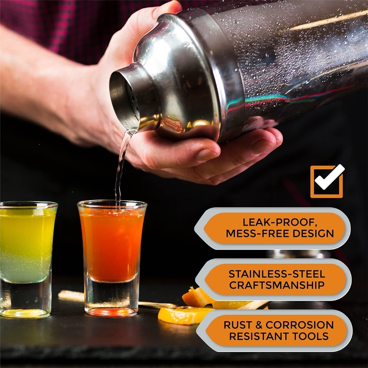 – El mejor kit de coctelera – incluye una coctelera grande – 25.4 fl oz – medidor de doble cara – 15/1.0 fl oz (15/1.0 fl oz), colador, vertedor de licor, mortero de cóctel, cuchara de bar, pinzas de hielo, sacacorchos de doble palanca, soporte de bambú. – Craft deliciosas bebidas a los invitados les encanta – Diseñado para principiantes y profesionales camareros. Este juego de coctelera viene con todas las herramientas que necesitas para mezclar bebidas como Martini, Mojito, Margarita, Cosmopolitan, Bloody Mary y otros grandes favoritos. – Hermoso y elegante juego de regalo: fabricado con acero inoxidable 304, nuestro juego de barras viene con un hermoso soporte de madera de bambú para mantener las cosas limpias y organizadas en tu cocina o tu bar de casa. Es una gran idea de regalo de vacaciones o cumpleaños para familiares o amigos.