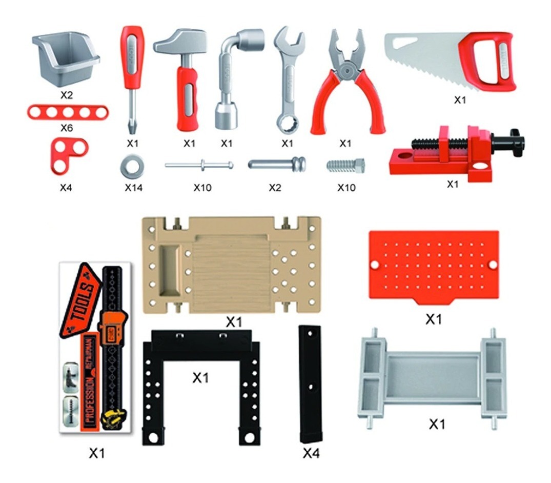 Banco de trabajo con herramientas para crear, montar y desmontar! Un banco colorido con 2 frentes de trabajo, equipada con muchas herramientas y acessorios! El juego será de montar y desmontar, atornillar y desatornillar y lo que más quiera la imaginación!