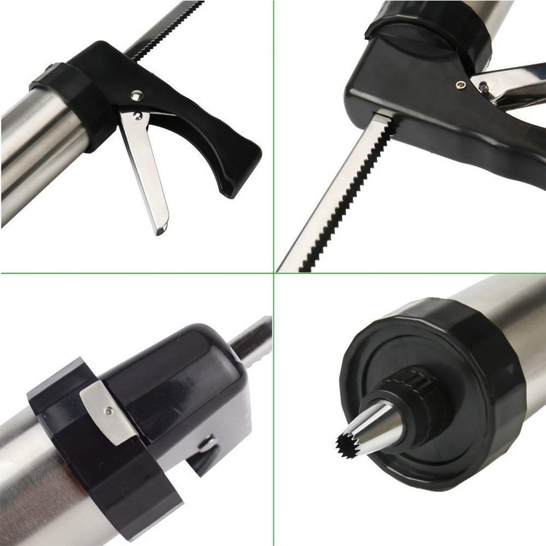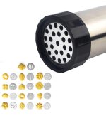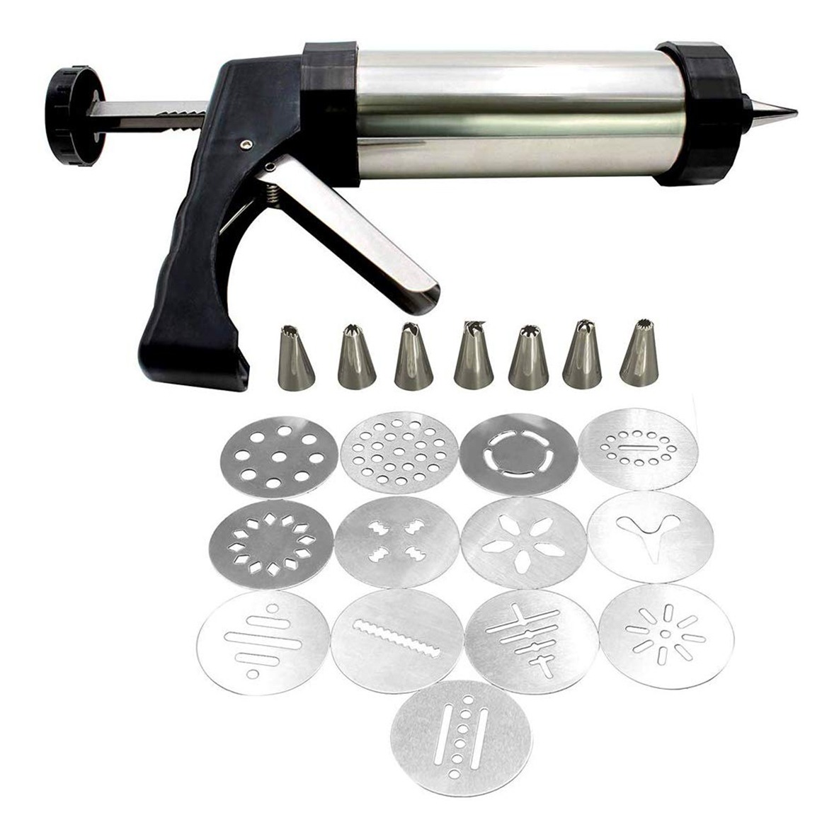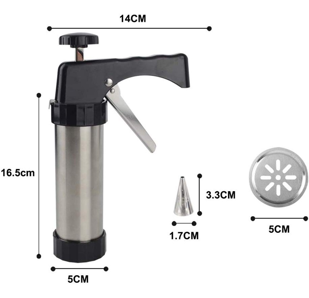 – Pistola en acero inoxidable con mango de plástico y mecanismo metálico. – Cuerpo de 14 cm x 5 de diámetro. – Además incluye 13 moldes para galletas y 8 punteros para decorar.