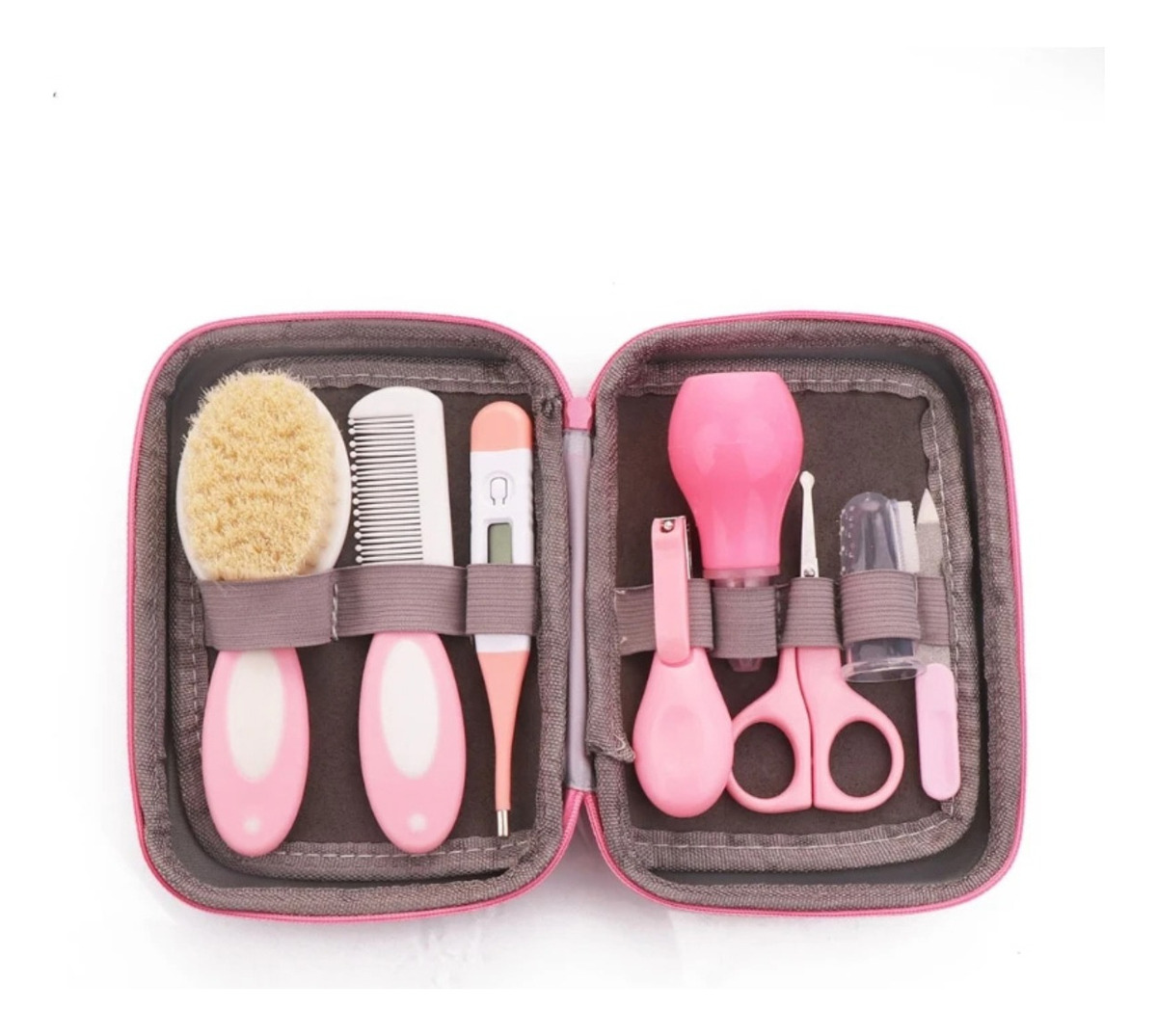 Pack de 8 accesorios para el cuidado personal de bebés y niños en la primer infancia.Incluye: 1 x Cepillo1 x Peine1 x Termómetro1 x Cortauñas1 x Tijera punta redondeada1 x Cepillo dental para dedo1 x Lima1 x Aspirador nasal1 x Estuche con cierre