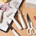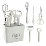 Piezas: Pelador, destapador, batidor, tijera y cuchillo + base.