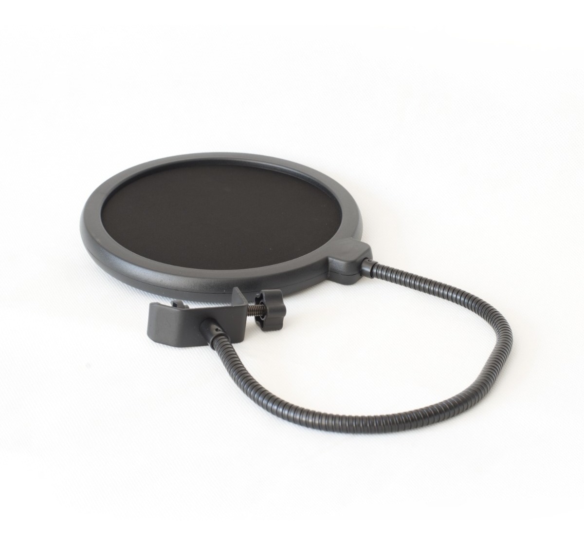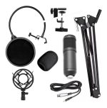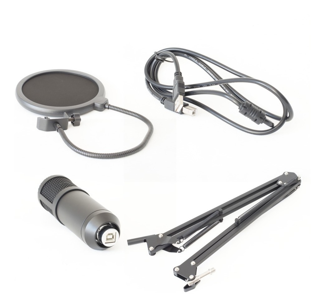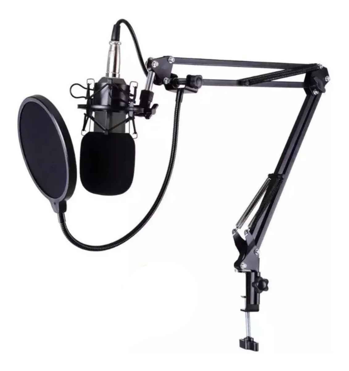 Set de micrófono que incluye: Mirófono Antipop para el micrófono (lo cubre) Filtro Antipop circular Brazo movible con prensa para escritorio Araña Cable Manual de instalación