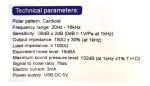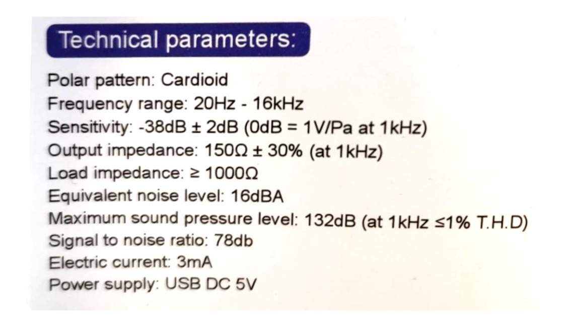 Patrón polar: Cardioide Rango de Frecuencia: 20Hz – 16kHz Sensibilidad_ -38dB +/- 2dB ( 0dB = 1V/Pa a 1kHz) Impedancia de salida: 150ohm +/- 30% a 1kHz Impedancia de carga: 1000ohm Equivalencia de nivel de ruido: 16dBA Nivel de presión sonora máxima: 132dB Relación de señal a ruido: 78db Corriente electrica: 3mA USB DC 5V