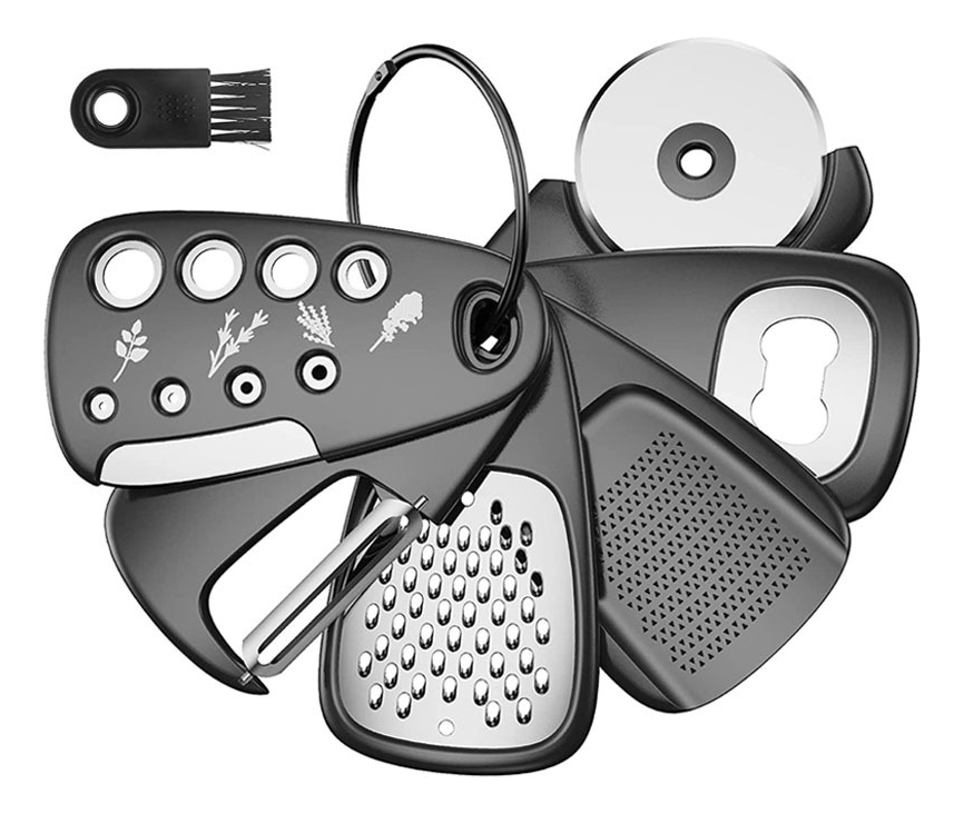 Set 6 en 1 de utensilios para la cocina. Contiene: – pelador de hierbas – rallador – rallador de ajo – cortador de pizza – destapador de botellas – Pela papas
