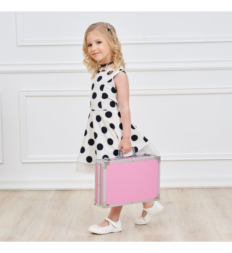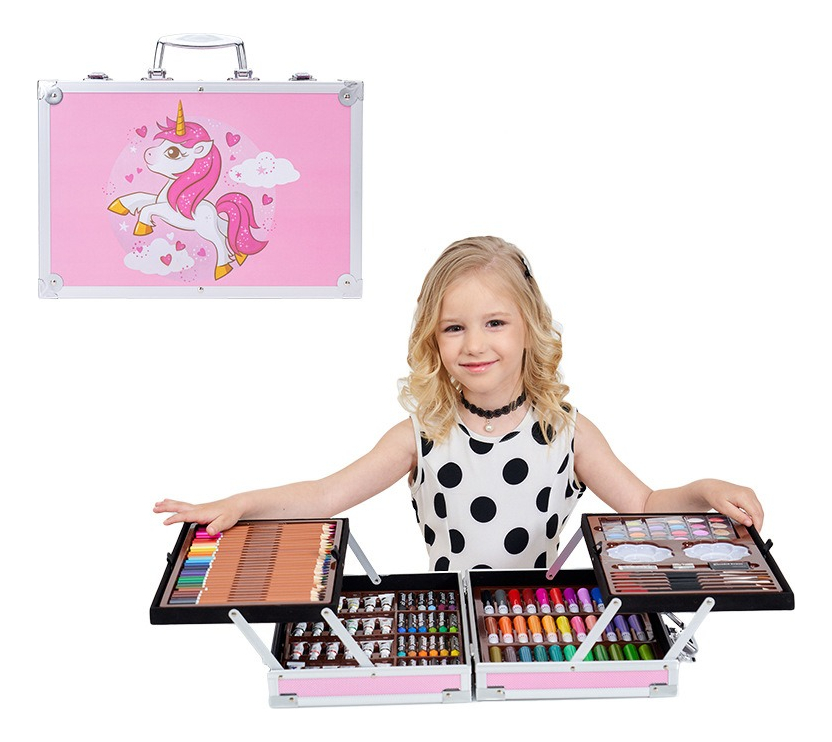 Todo está guardado en una práctica valija metálica, ideal para mantener el material ordenado y transportarlo fácilmente. Un regalo perfecto para los más pequeños, permitiéndoles explorar su talento artístico.