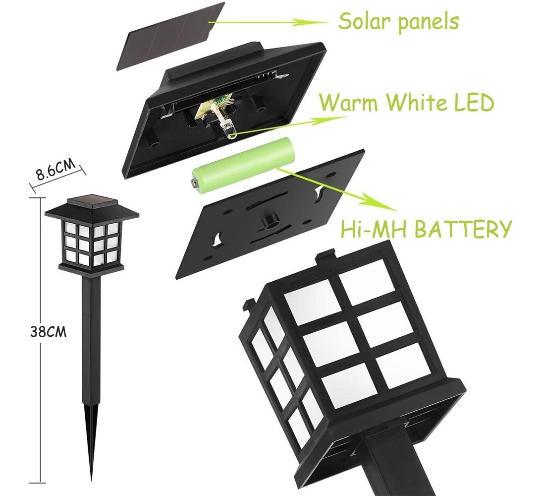 LUCES SOLARES: No se necesita cableado. Las luces LED se pueden instalar en dos minutos. Apague la tapa de la lámpara, encienda el interruptor de la lámpara, ensamble las piezas de acuerdo con las imágenes, finalmente insértelas en el suelo para completar la instalación. DECORACIÓN EXTERIOR PREMIUM : Las luces de jardín al aire libre son hermosas para decorar. Agregue un brillo agradable a su carril, terraza, parterres o patio BATERÍA DE ALTA CAPACIDAD: 4 horas de luz solar proporcionan a las luces del jardín una carga completa para durar toda la noche. Los paneles solares de calidad superior recogen la luz de forma rápida y eficiente para garantizar un maravilloso rendimiento de la luz solar. USO MULTIPROPÓSITO: estas luces solares de paisaje se pueden usar en el frente o en el patio trasero, a lo largo de la entrada, la acera o la acera, o alrededor de su patio o porche. ABSOLUTAMENTE A PRUEBA DE CLIMA: Solar Lights Outdoor es adecuado para días soleados, lluviosos y nevados. Material: Plástico Batería: batería recargable 1.2V / 1PC 150mAh AAA Ni-MH (preinstalada) Panel solar: 2V 26ma Tiempo de trabajo: hasta 8 horas después de la carga completa Tamaño: 3.35 * 3.35 * 15 » /8.5 * 8.5 * 38cm