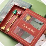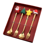 Set de 4 cubiertos diseño navideño. Cada caja contiene dos cucharas y dos tenedores. Medida: 16.5 cm largo aprox. Color: Dorado Caritas del diseño: coloridas Aprovecha a decorar tu mesa con un toque navideño original.