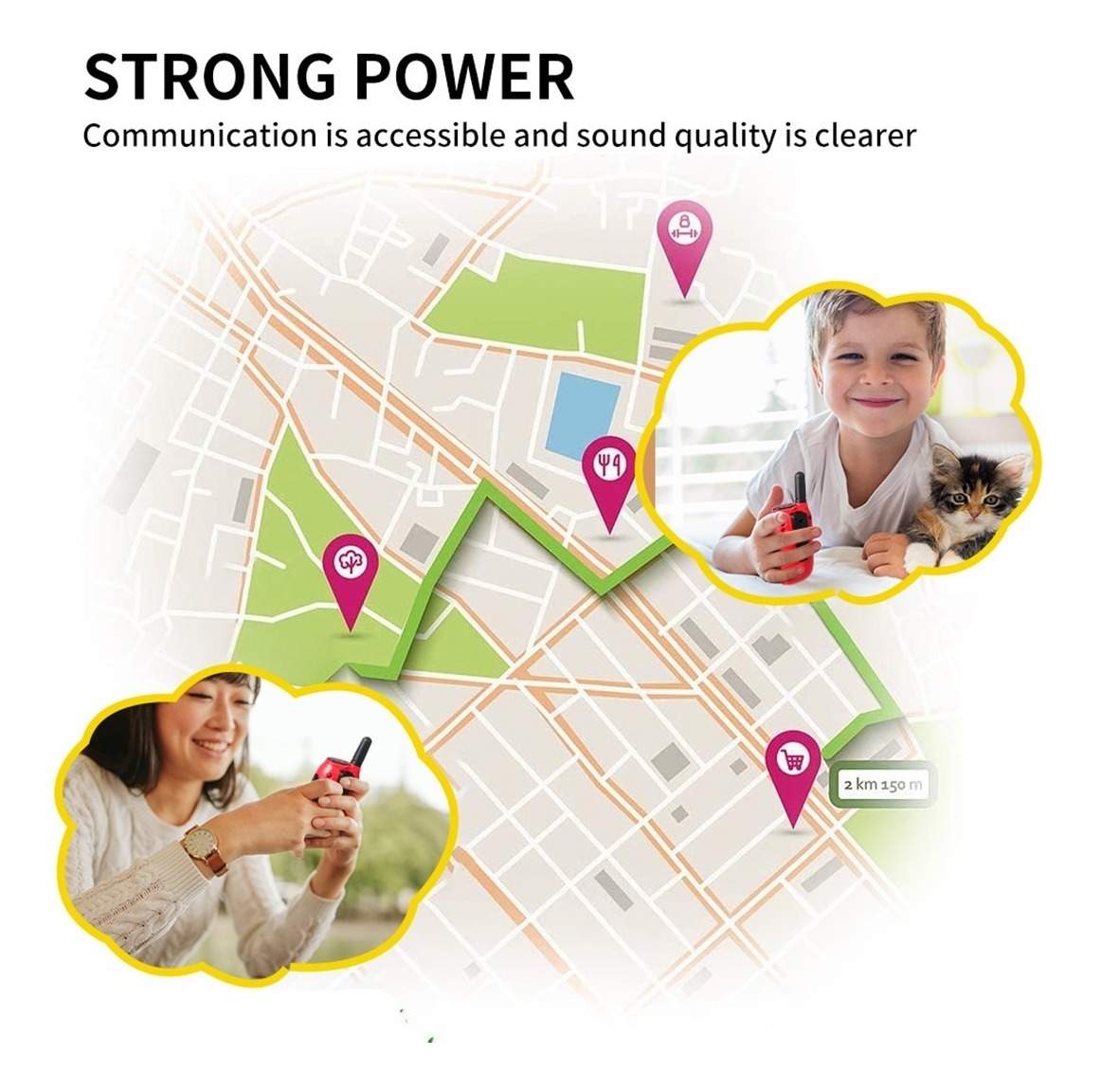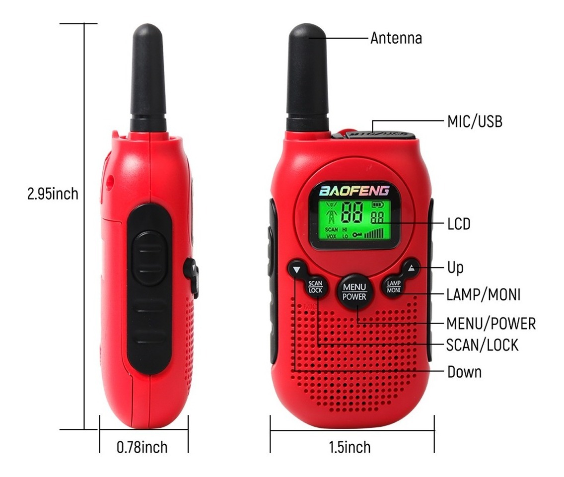 – Pantalla: LCD color – Cantidad de canales: 22 Canales – Rango Operativo: 5 km – Fuente: Batería (Duración de la batería 12 horas) – Alerta de batería baja – Led función linterna