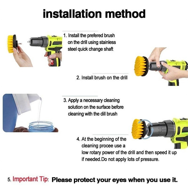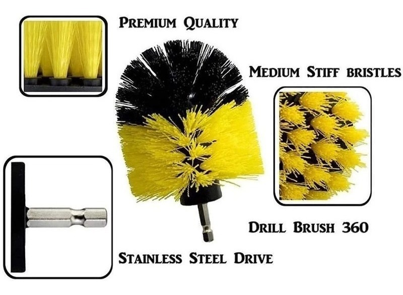 Cepillo para fregado de área amplia, no se incluye un taladro inalámbrico en el paquete. Ahora con un eje de cambio rápido que se adapta a todos los taladros e impulsores de impacto Construcción bien construida y duradera para usar tanto en interiores como en exteriores. La rotación de alta velocidad del taladro, combinada con el cepillo de cerdas de alta calidad, limpia y quita fácilmente manchas en cuero y tela de tapicerías o alfombras. El cepillo de taladro amarillo medio está diseñado para el fregado riguroso de alfombras, bañera y azulejos y pisos. Las cerdas son lo suficientemente rígidas como para desalojar manchas antiguas y se sujetarán mejor que el cepillo de alfombra suave en alfombras de alta resistencia. También puede usar este cepillo en azulejos, lechada y almohadillas para el suelo.