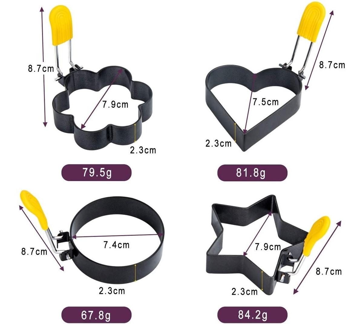 – Alta calidad: el set de anillos para huevo está hecho de acero inoxidable no tóxico e insípido, no se oxida, no se deforma, antiadherente y puede ayudarte a hacer un huevo redondo de tortilla perfectamente. – Fácil de usar: simplemente levanta el mango plegable del molde, colócala en tu plancha eléctrica o sartén, luego recubre con aceite y llega al huevo frito. – Fácil de limpiar: debido al material de metal de acero inoxidable de la tortilla, el tortita se puede limpiar rápidamente con una pequeña cantidad de agua desengrasada. – Multifunción: ideal para hamburguesas, pan, huevos, tortillas, sándwiches de desayuno, magdalenas de huevo y tortitas. Lo suficientemente profundo como para añadir fácilmente extras como verduras, queso, o jamón cocinado o tocino.