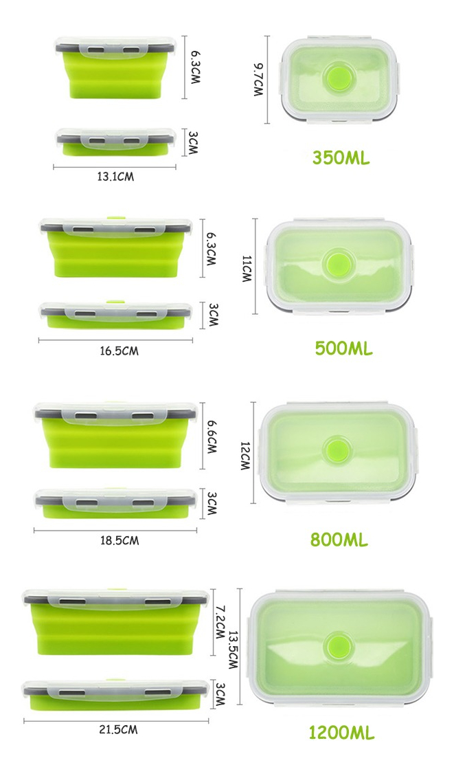 Característica: – Material de calidad alimentaria, saludable y seguro. – Fácil de limpiar, apto para lavavajillas. – Apto para microondas y congelador. – Plegable y hermético. – Libre de BPA