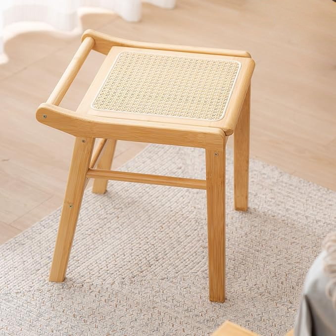 Taburete Banco Nórdico Bajo Cuadrado De Ratan Y Madera |