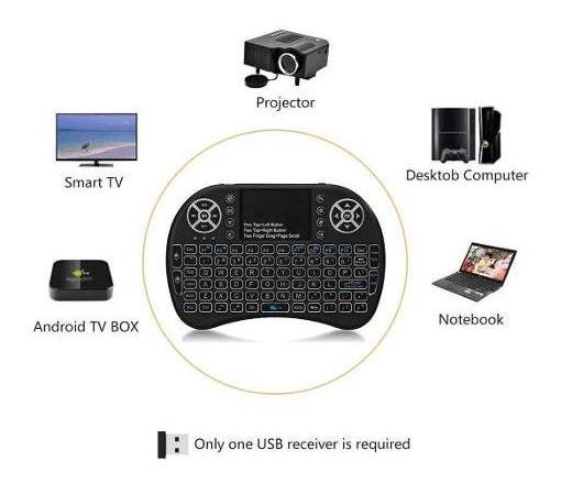 – Teclado Wireless con luz. – Frecuencia 2400 – 2483 MHz. – Rango operativo de 10 a 15 metros. – Tiempo de carga 1 hora • Autonomía 10 horas. – Batería recargable de Litio-ion. – Entrega en caja cerrada. – Apto para televisores SMART – SMARTBOX, PC, Notebooks, Consolas. – Funcionamiento inalámbrico 100%. – Pad para mouse incorporado en el mismo teclado.