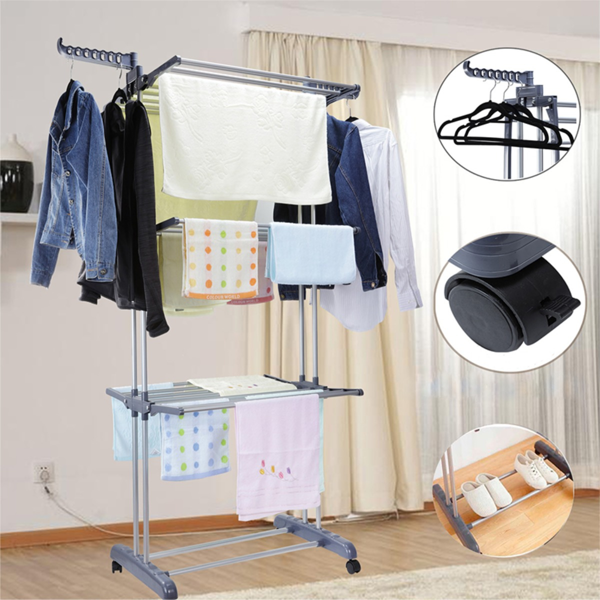 Perchero de secado de ropa ajustable de doble polo de tres capas, colgador plegable de acero inoxidable para lavandería