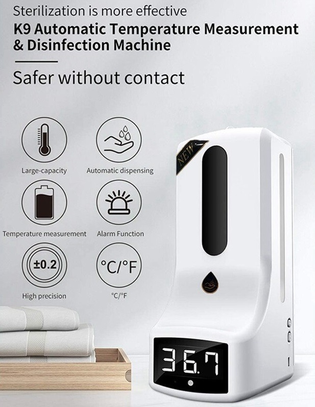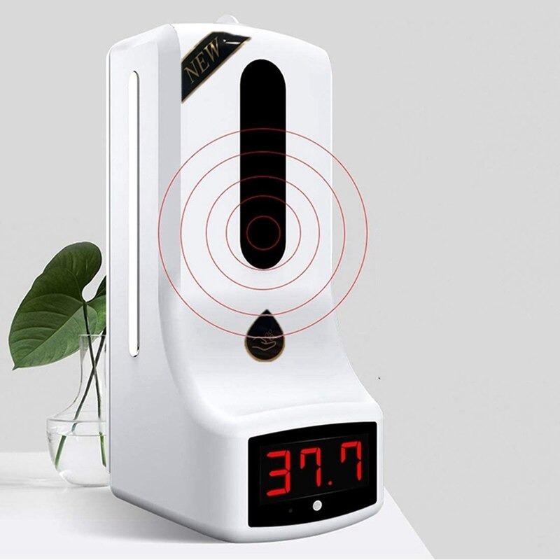 IDEAL PARA COMERCIOS. DISPENSADOR DE ALCOHOL EN GEL + TERMÓMETRO CON ALARMA. Dispensador de alcohol en gel con termómetro infrarrojo automático y alarma en caso de alta temperatura, dispensador automático de alcohol en gel, medición de temperatura corporal.