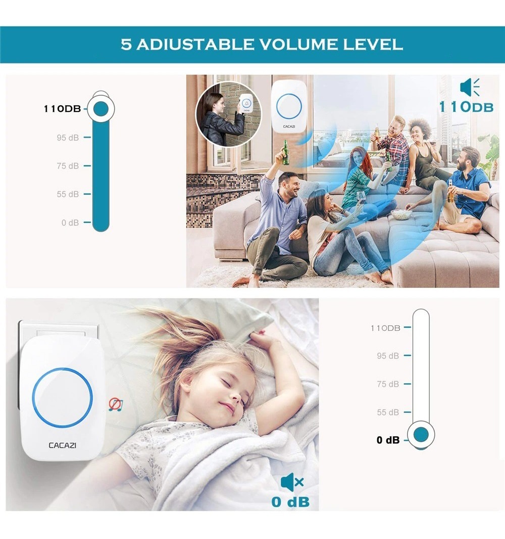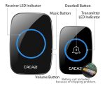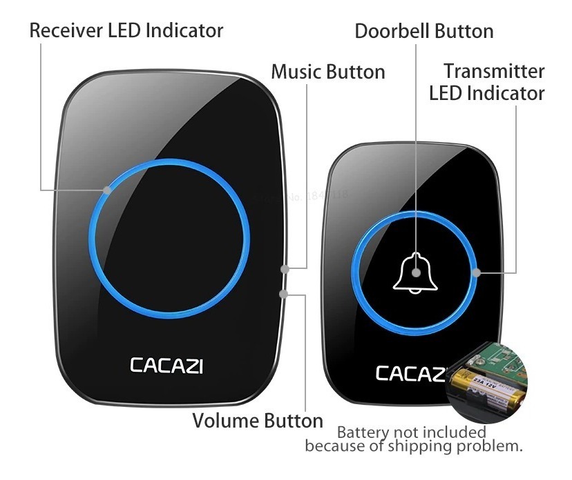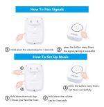 1 – El botón admite hasta 20 piezas y el receptor admite hasta 100 Uds. 2 – Si varios botones se emparejan con uno o más receptores en el mismo sistema, cada botón se puede configurar en un tono de llamada diferente. 3 – Función de memoria de Apagado: encienda la alimentación de nuevo después de apagarse, no es necesario volver a ajustar y bloquear el tono de llamada. 4 – El transmisor no tiene un diseño mandril enroscado. Puede ser impermeable y resistente al polvo sin anillo de goma. 5 – El transmisor utiliza una batería alcalina de 23A12V 6 – Voltaje del receptor: 110-220-240V. 7 – El receptor está disponible en una variedad de enchufes, enchufe US/EU/UK y adaptadores AU, adecuados para la mayoría de los países. 8 – Distancia de recepción: 300 metros en espacios abiertos. 9 – La señal inalámbrica se verá afectada por obstáculos. Cuantos más obstáculos, más grave será la pérdida de señal. 10 – El receptor Tiene 5 niveles (puede ser silencioso) 0-110dB, 60 música para elegir. 11 – Tamaño: transmisor 75x51x20mm, receptor 95x65x24mm.