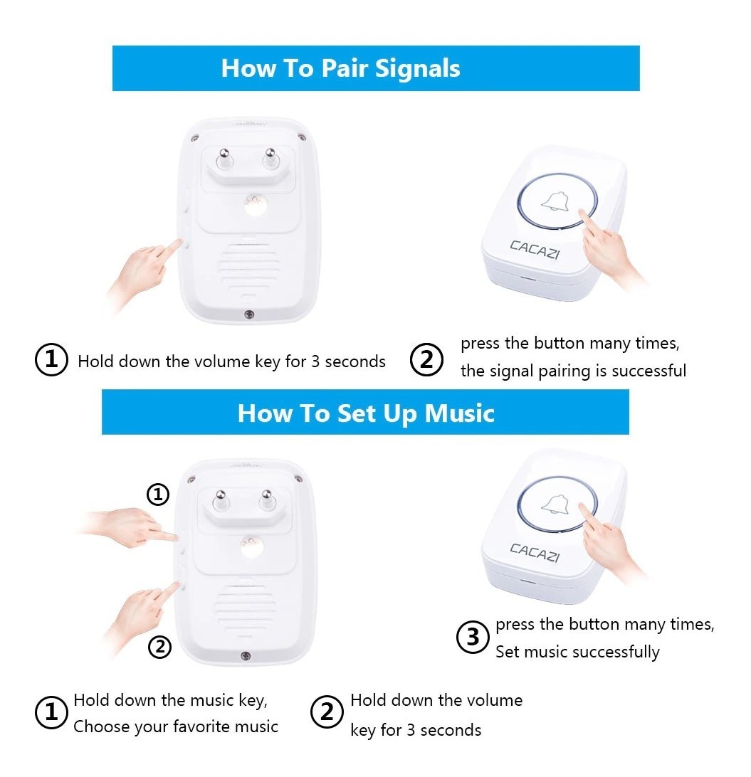 Mantenga presionado el botón de volumen del receptor antes de enchufar la toma de corriente. Conecte la toma de corriente hasta que la luz del receptor se ilumine, suelte el botón de volumen, presione el botón de música para ajustar al tono de llamada de música favorito, mantenga presionado el botón de volumen de nuevo hasta que la luz esté encendida, presione el transmisor dos veces inmediatamente y la música se bloquee correctamente.