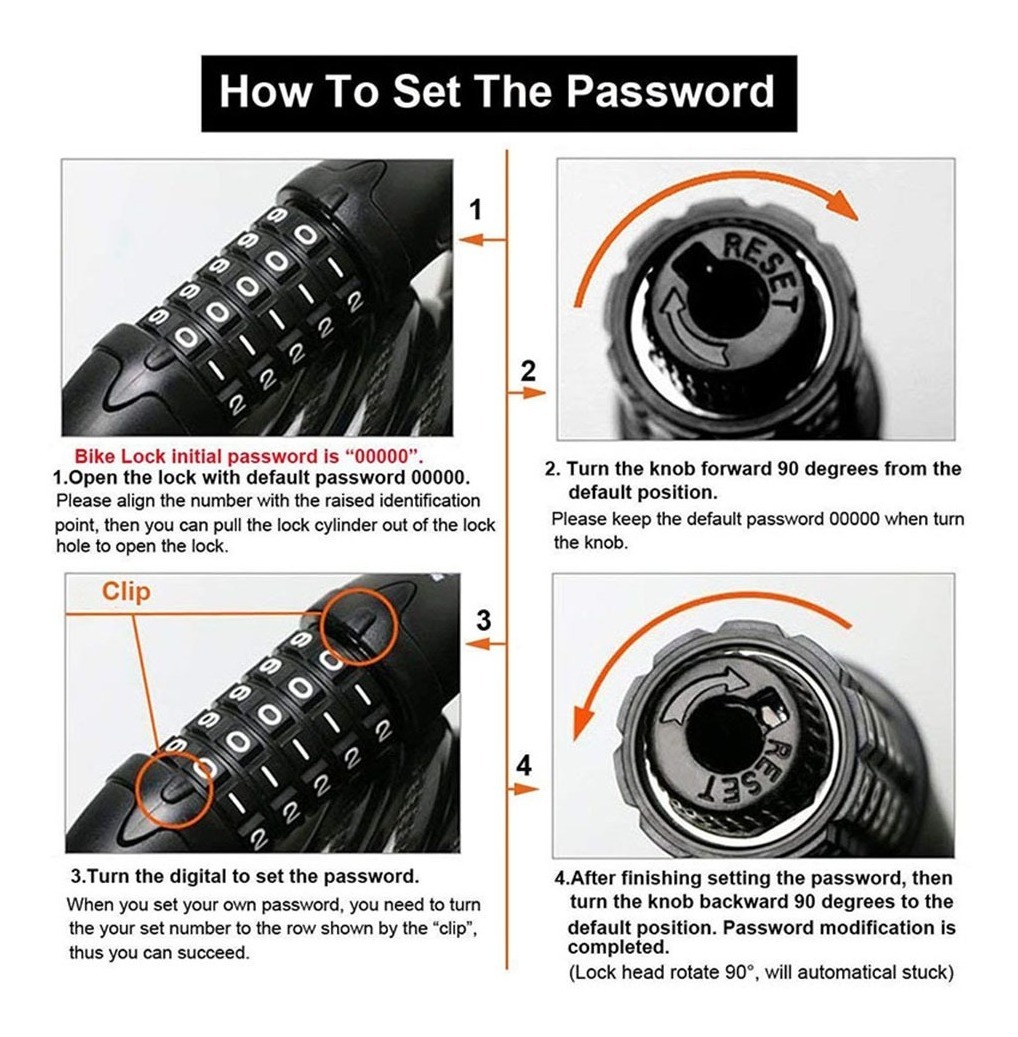 Modo De uso: Esta cerradura está preestablecida para funcionar a las 00000. Para establecer su propia combinación, siga los siguientes pasos; 1. Marque las ruedas de combinación a 00000 y retire el cable. 2. Gire la perilla 90 grados en el sentido de las agujas del reloj a la posición designada 3. Reinicie las ruedas de combinación a la combinación deseada, asegurándose de que los números estén alineados con el puntero. 4. Has seleccionado tus números combinados, gira la perilla de nuevo a la posición original en sentido antihorario. 5. La nueva combinación ahora está configurada.