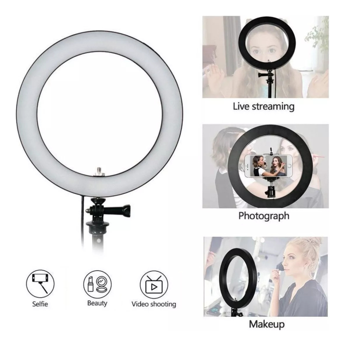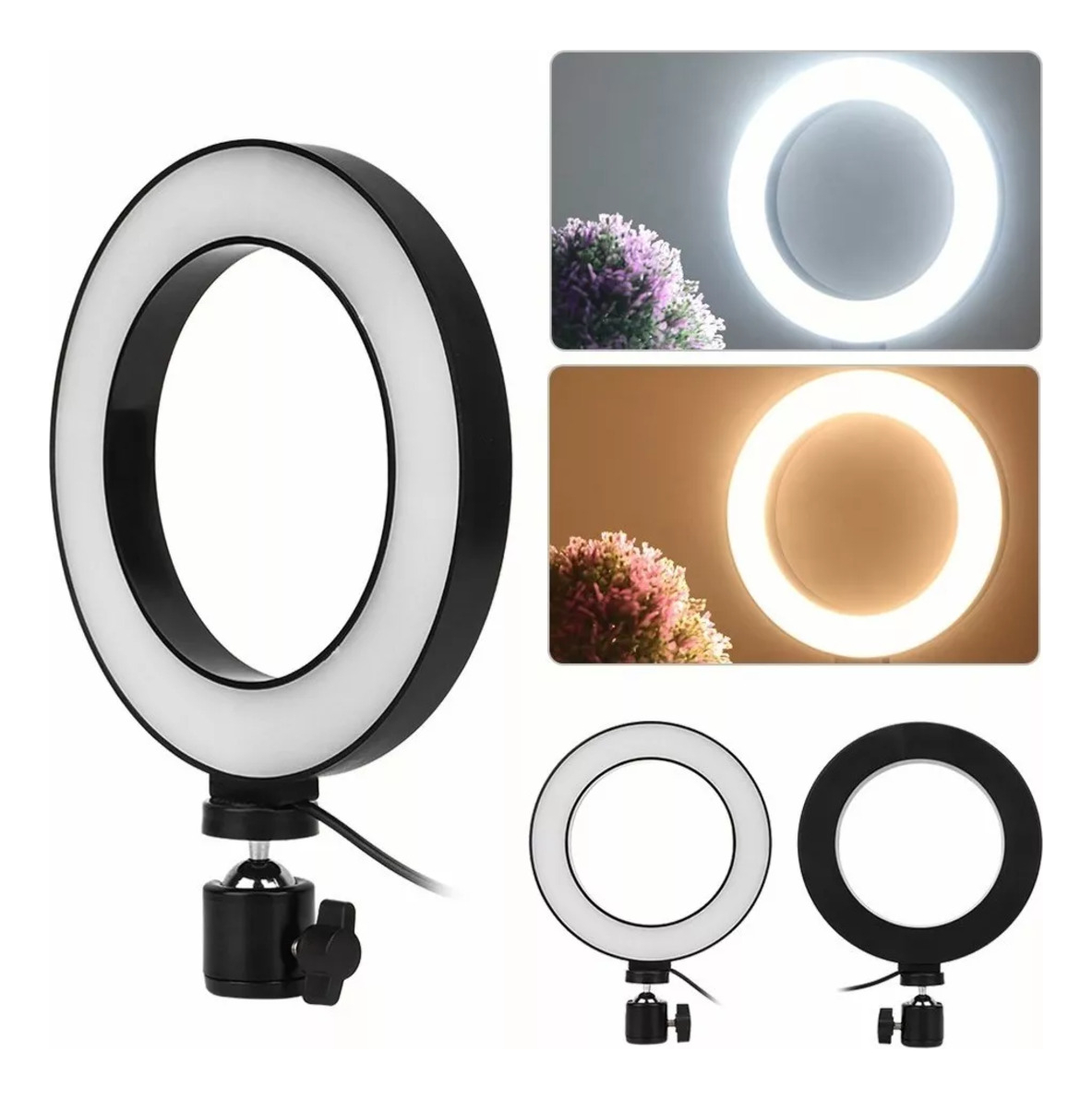 Este práctico combo es perfecto para sesiones de fotografía, grabación de videos, transmisiones en vivo o maquillaje. Diseñado para brindar comodidad y versatilidad, incluye un aro de luz USB y un trípode extensible que se adapta a diferentes necesidades.