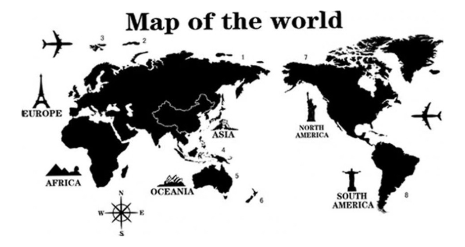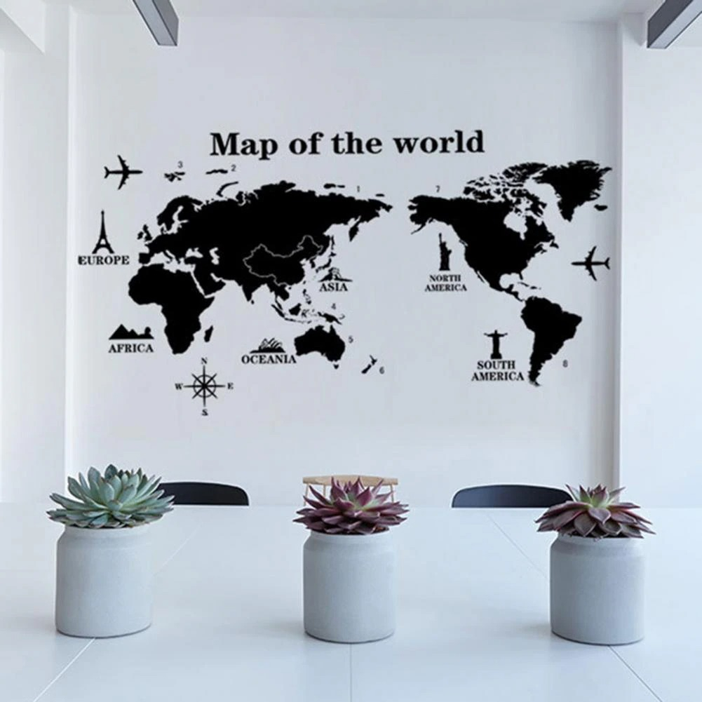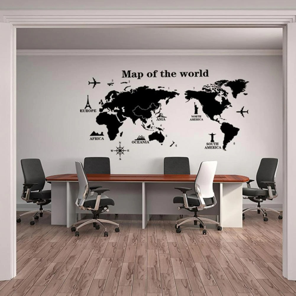 Vinilo de mapamundi negro para pared, ideal para living, dormitorio, oficina, etc. Fácil de colocar.