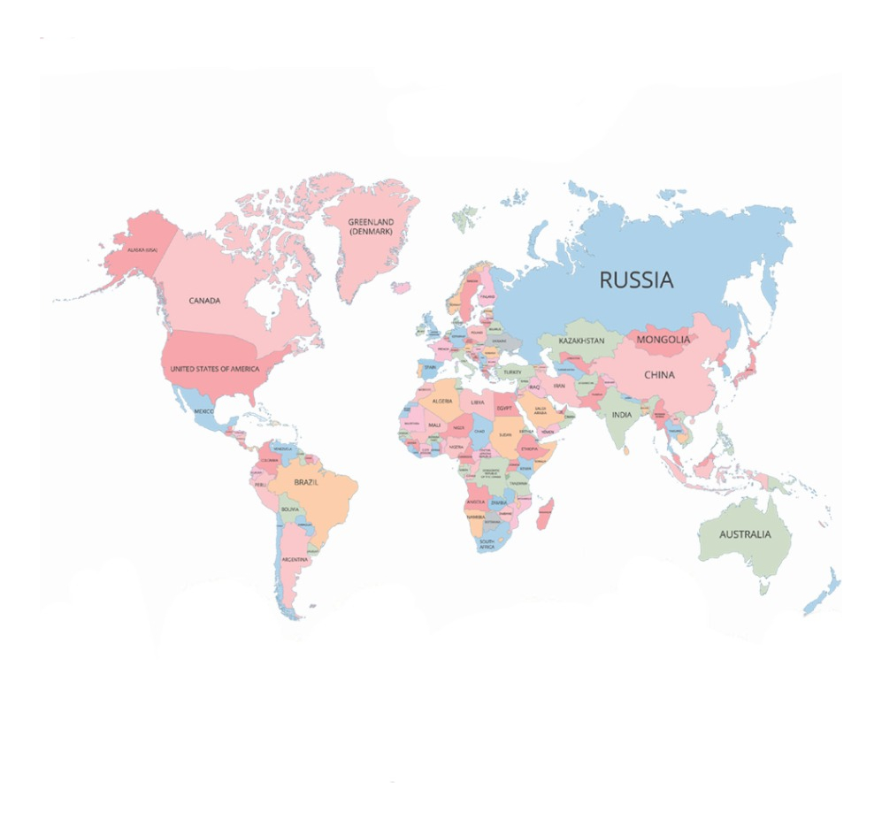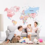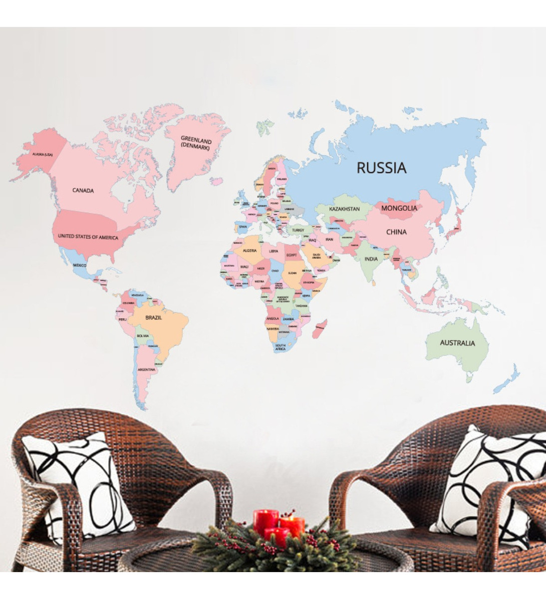 Vinilo de mapamundi multicolor para pared, ideal para living, dormitorio, oficina, etc. Fácil de colocar.